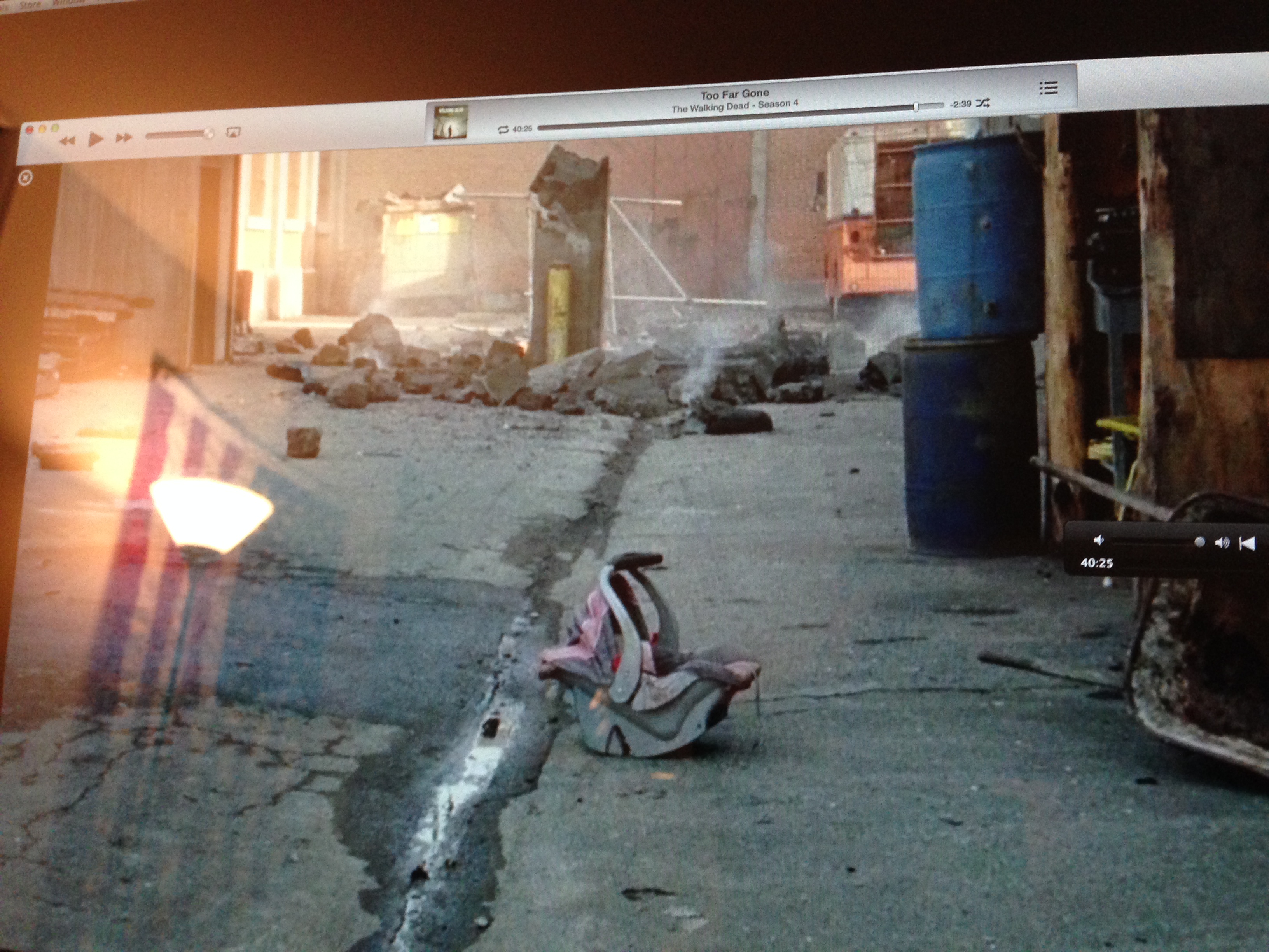 This is the only shot of Judith we actually get in the episode. Note one really important detail: she’s buckled into her car seat. She’s also way too big for it, but we’ll let that slide on account of zombie apocalypse.