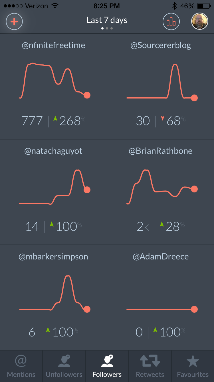Dreece’s line, by the way, has got to be wrong– he’s also showing no unfollowers for the last seven days and I don’t believe for a second that anyone’s account has that little churn. Dude’s got nearly 3000 followers. Something changed last week.