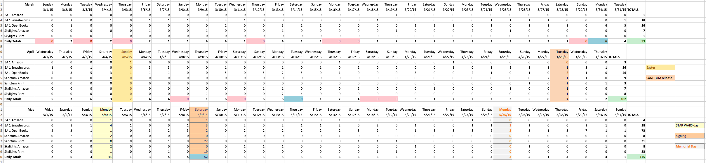 I had a total of 175 sales in the month of May. The majority of those were for Benevolence Archives, Vol. 1, which is free everywhere but Amazon– a total of 105. 73 of those were through OpenBooks.com, which I’ll need to devote a longer post to later, and which is currently my most active vendor. The amazing thing is that even if you cut the OpenBooks sales entirely out of the total I still tied my best month of 2015. The Sanctum of the Sphere had 39 sales, and Skylights had 31. My best day was, unsurprisingly, May 9th, which was the day of the signing. I had 52 sales across all of my vendors. Again, though, a testament to the strength of the month: you can delete all 52 of those and I’m still way over where I was in April.