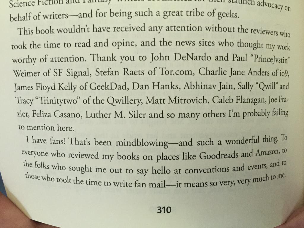 So… I need a disclaimer now, I guess? This book was totally getting a rave review before I found my name in it. And now I need to stalk Michael J. Martinez and find him at a convention somewhere so I can get this thing signed.