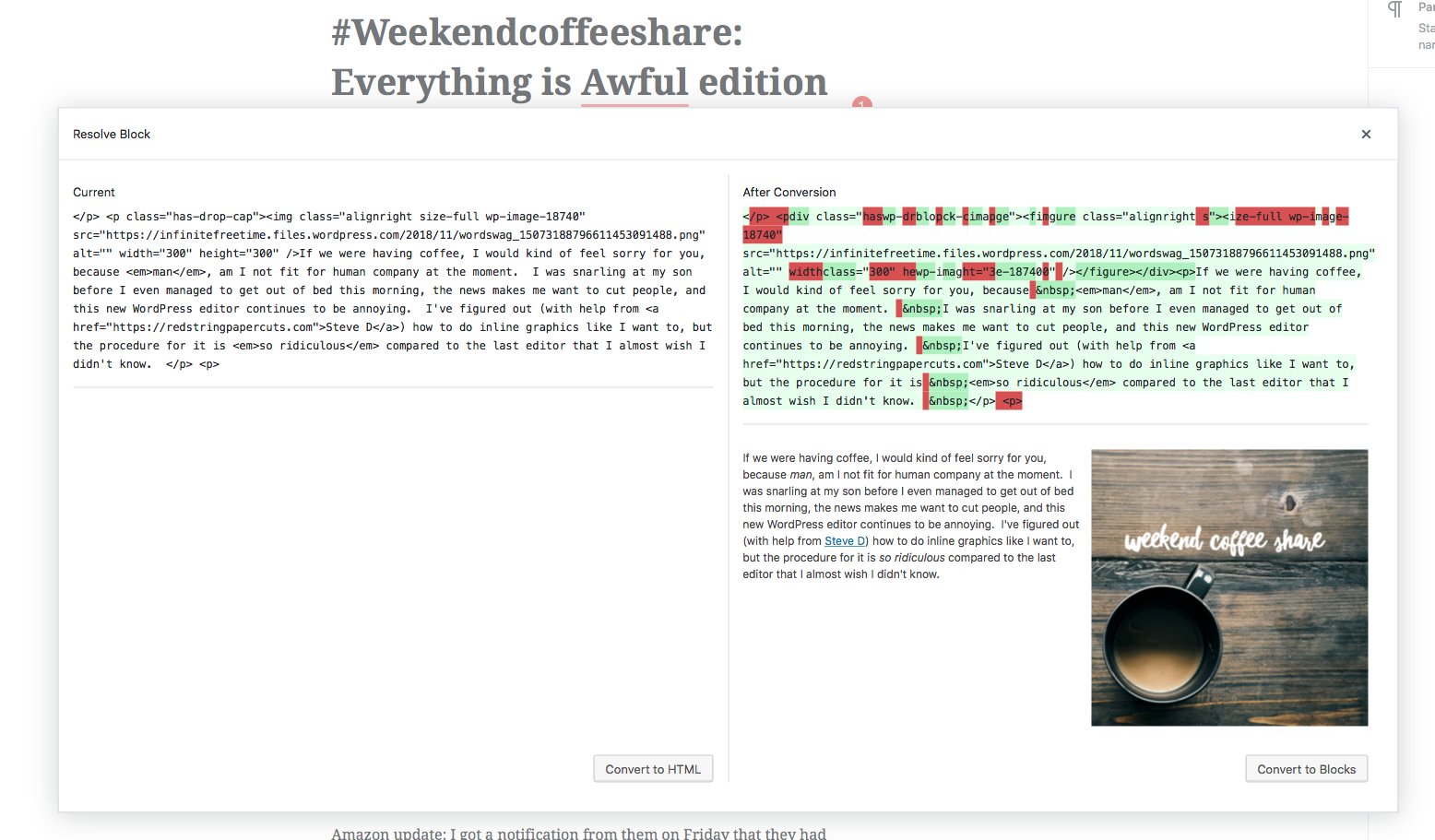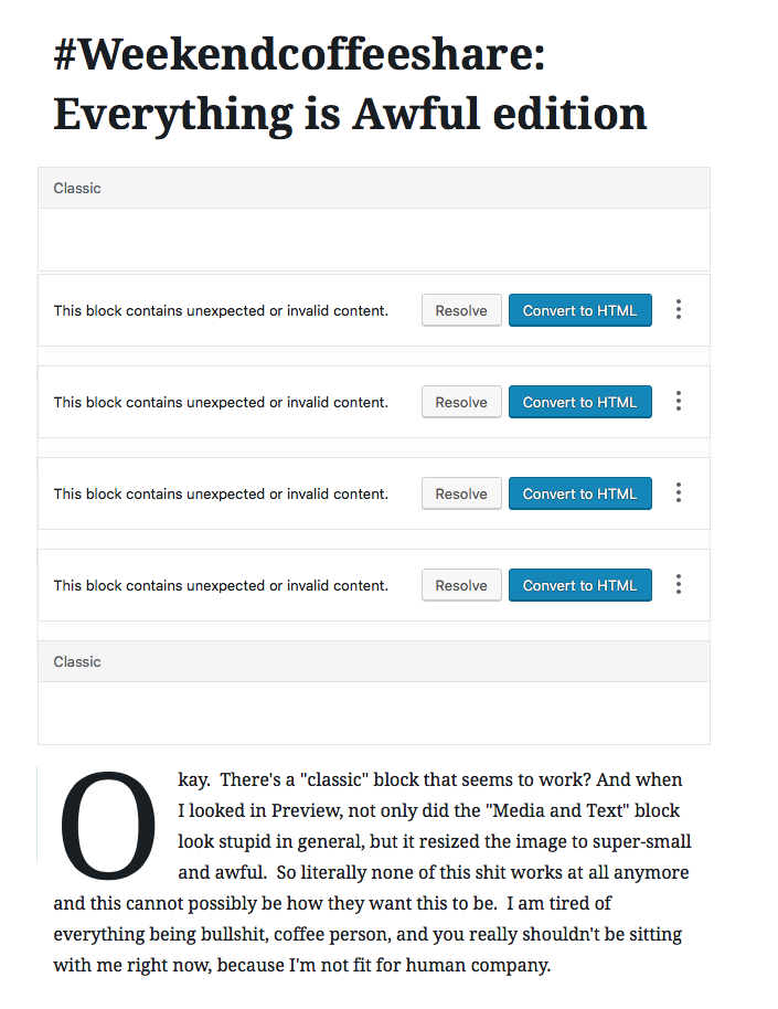 Okay. There’s a “classic” block that seems to work? And when I looked in Preview, not only did the “Media and Text” block look stupid in general, but it resized the image to super-small and awful. So literally none of this shit works at all anymore and this cannot possibly be how they want this to be. I am tired of everything being bullshit, coffee person, and you really shouldn’t be sitting with me right now, because I’m not fit for human company.