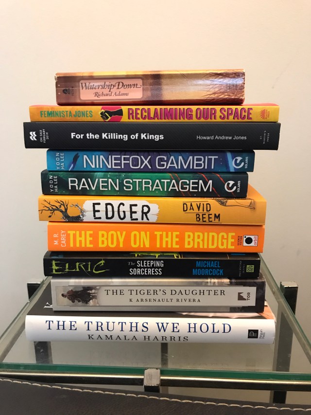 1. Tiger’s Daughter, no doubt about it. Everything in the stack other than the Elric book (which marks the point where I finally admitted I think Michael Moorcock is terrible, and I’m gonna stop trying) is absolutely worth attention, though.