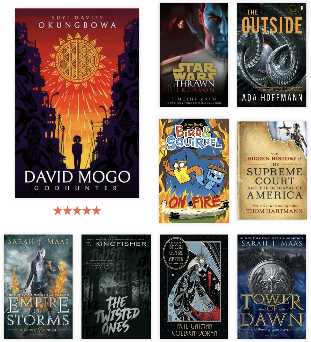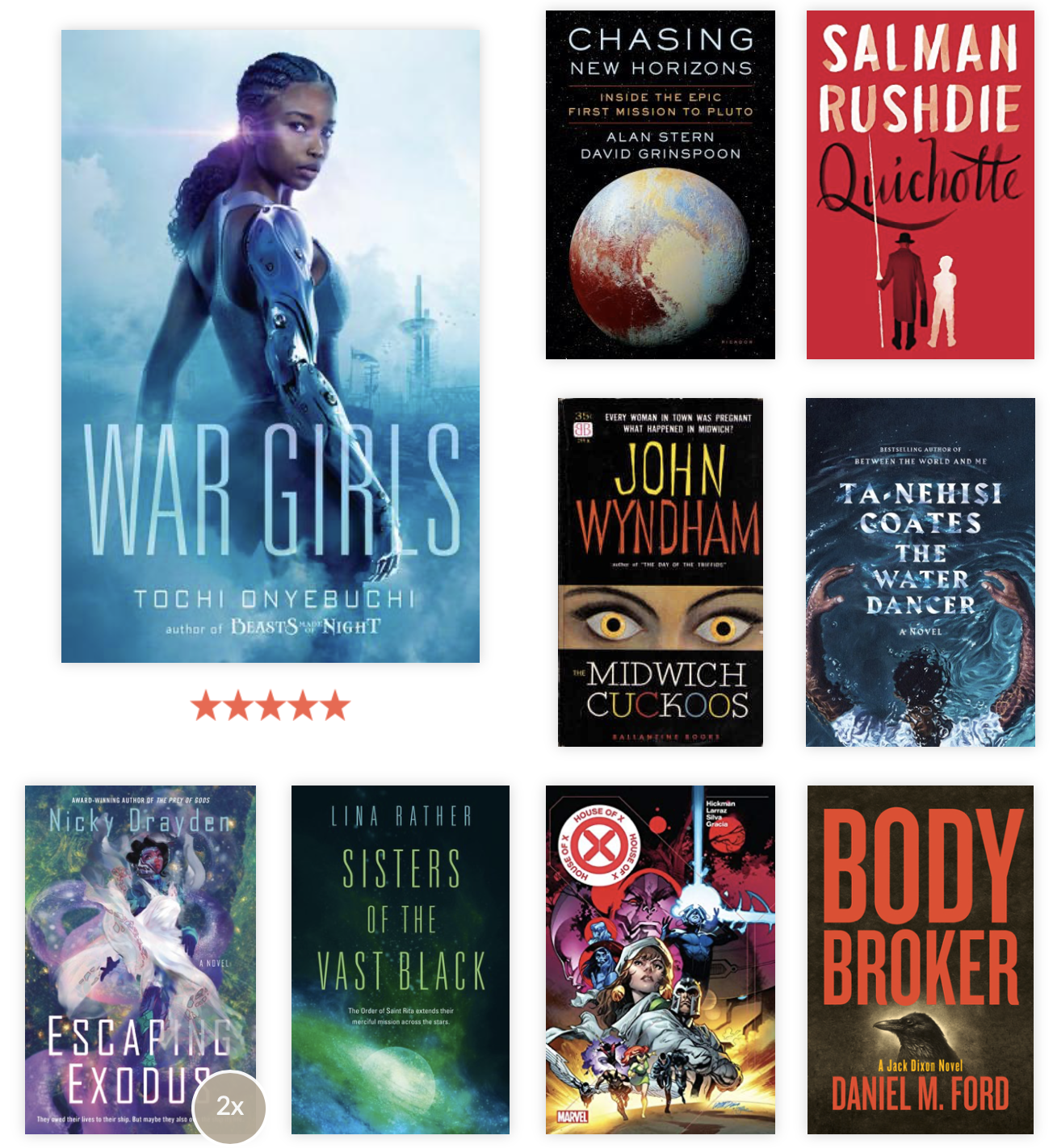 HONORABLE MENTION, in NO REAL ORDER: ON THE COME UP, by Angie Thomas, CIRCE, by Madeline Miller, A STORM OF LOCUSTS, by Rebecca Roanhorse, THE HUNGER, by Alma Katsu, BODY BROKER, by Daniel M. Ford, QUICHOTTE, by Salman Rushdie, INTERNMENT, by Samira Ahmed, FRESHWATER, by Akwaeke Emezi, THE OUTSIDE, by Ada Hoffman, THE MIDWICH CUCKOOS, by John Wyndham, and THE WATER DANCER, by Ta-Nehisi Coates.