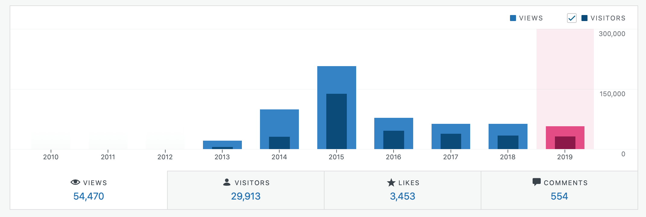 Posting frequency was up from last year, which was up from the year before it, but engagement is continuing to drop. I’d like to find a way to drive more comments, definitely, and more likes would always be nice, but I’m not sure what the best way to do that is. I keep hearing that blogs are dead; needless to say, this one ain’t going anywhere; while I’d like to more engagement, I’m not gonna shut up or anything if my numbers keep falling.