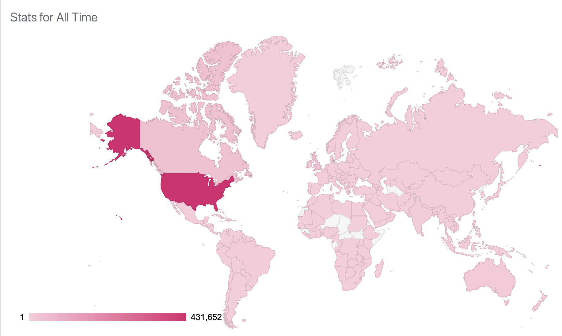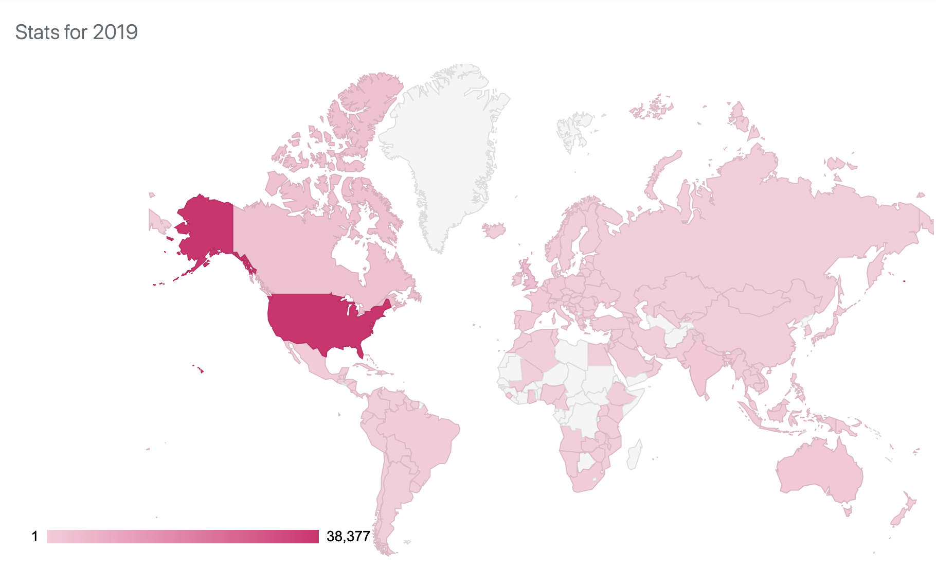 Basically at this point I only have a few types of countries left: totalitarian dictatorships (North Korea), a few tiny islands, and places where there is either very little infrastructure or very few people or both. I keep hoping to get a hit from Svalbard Island and so far it hasn’t happened yet. That little hole in Europe is still Kosovo; I refuse to believe I have never had traffic from Kosovo in six years and am blaming something wonky about the way WordPress handles geography.