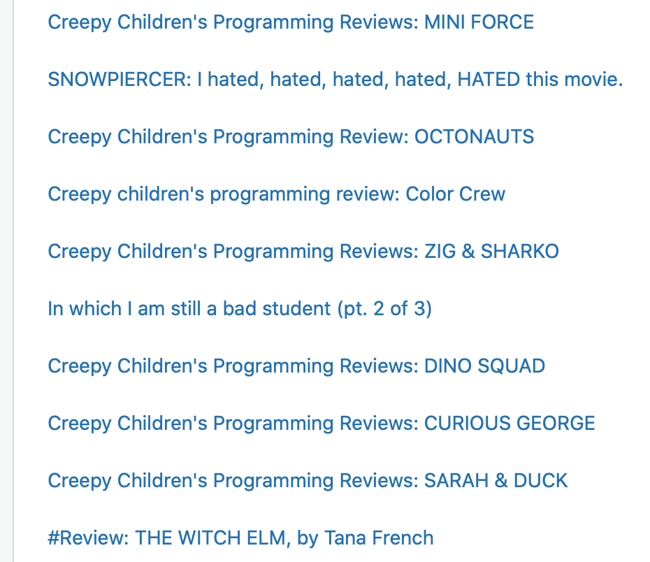 The Snowpiercer post just refuses to die, although it did have one (1) day this year where it got zero hits, which very well might be the first time that has ever happened. Supposedly the TV show is launching soon, so this will never, ever end. I feel bad about the weird popularity of that Tana French post, too; it’s literally the only thing she ever wrote that I didn’t like and I reviewed a bunch of her other books, so it sort of feels unfair to me. I love you, Tana! I swear!