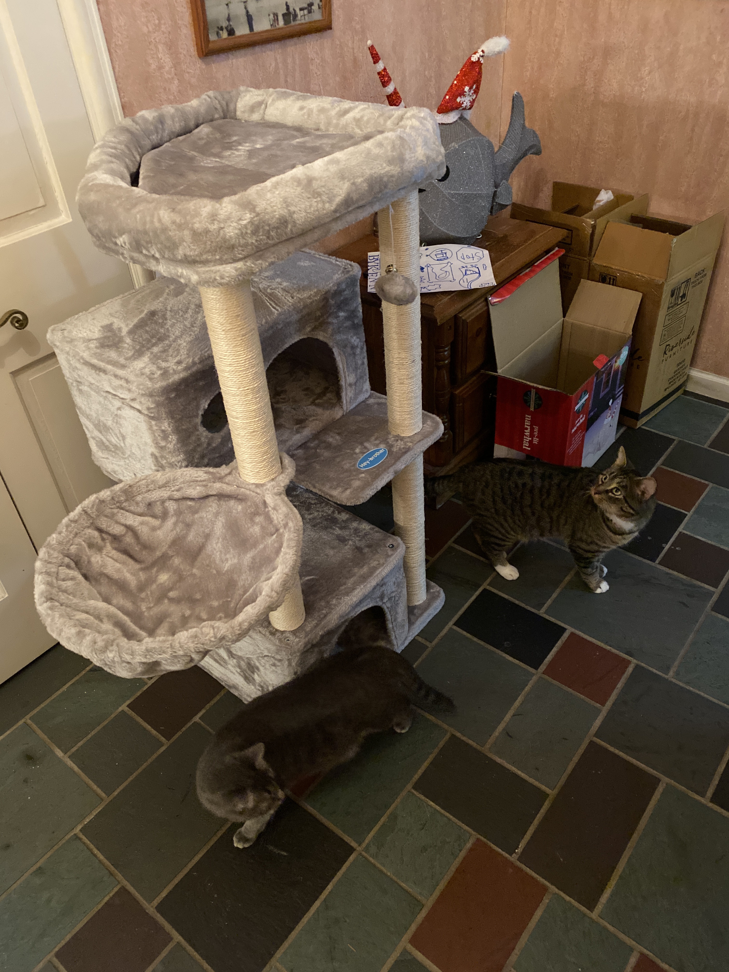 The little bastards are ignoring it, of course, as is their wont. We haven’t settled on a final place to put it; a giant cat tree is not the first thing I want people to see when I let them into my house.