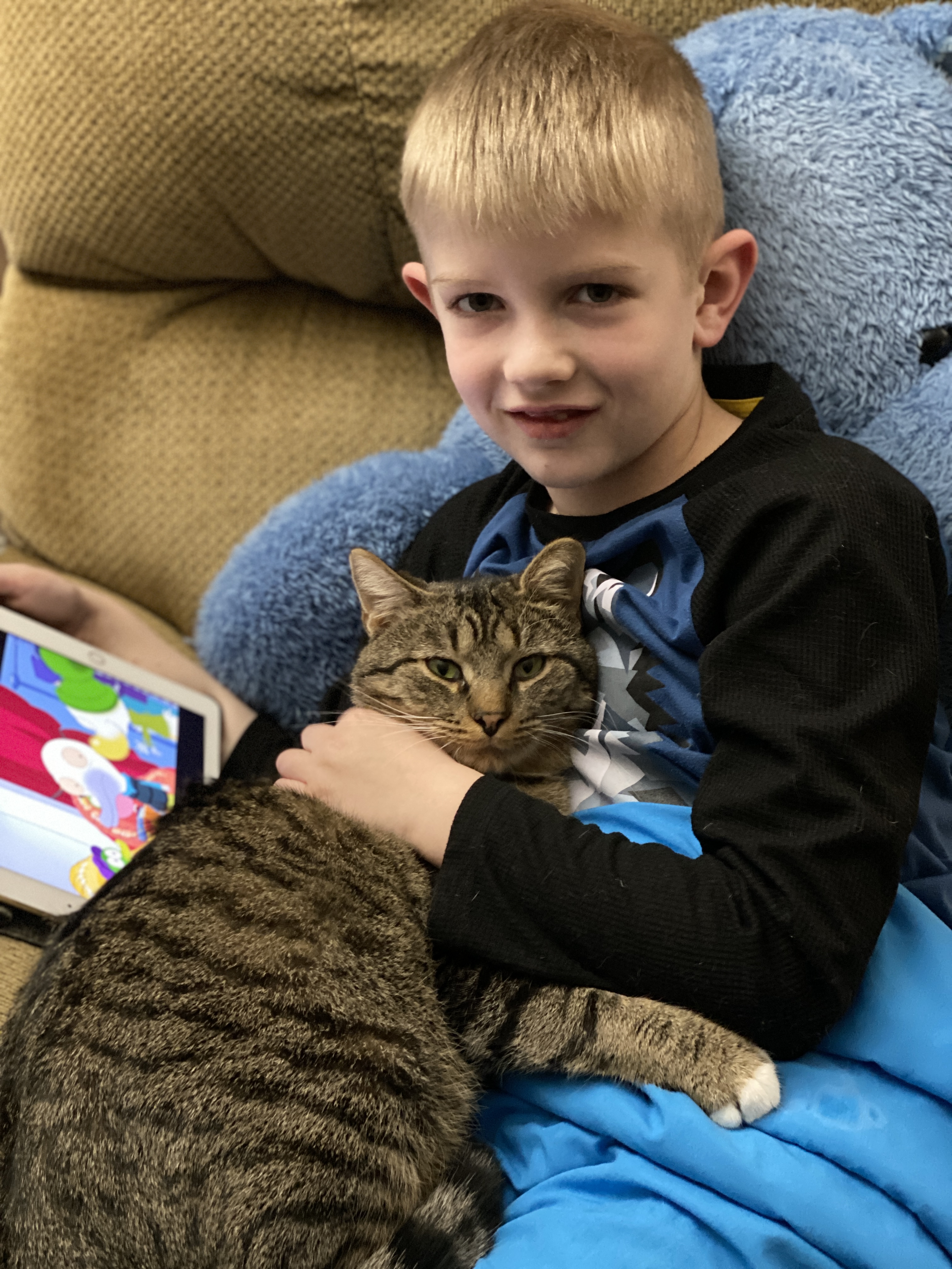 A true fact about this cat, who suddenly figured out laps this afternoon and spent about an hour cuddling with the boy, who has been home sick from school for a couple of days: his shit stinks worse than the shit of any other pet, of any species, that I have ever had, and it not only fucks up huge chunks of my house to the point where I feel like we’re going to have to renovate our HVAC system to provide for greater air movement where we’ve got the litter boxes, it clings to him afterwards for a while, so if he uses the litterbox and then runs into the living room to demand scritches you will be able to tell where he has been. It is monstrous and terrifying and we are well beyond the point where I can chalk it up to him having been an outdoor cat and eating rats to stay alive. Dude’s been in the house for like two months now, there ain’t nothing in there but kibble and Fancy Feast. The other cats don’t stink like this. Not even close.