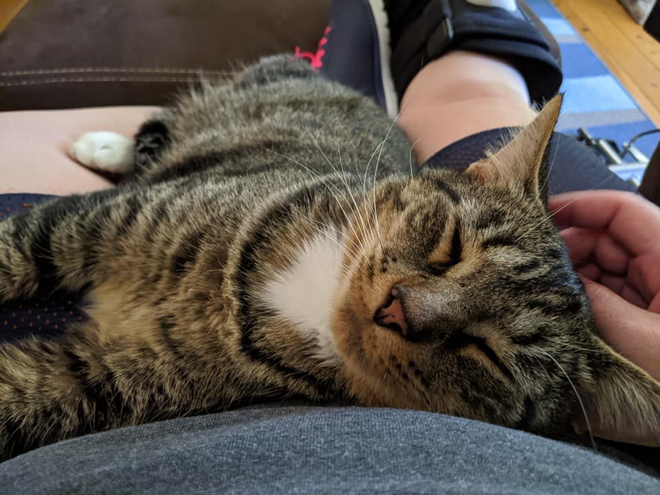 Spent today mowing and reading; this lazy bastard spent today laying on my wife. I think my favorite thing about him is that black ring around his neck; it goes all the way around, and if we ever decide to have his head mounted on a wall or turn him into some sort of futuristic head-mounted-on-a-hovering-robot-body cat we have a perfect place to start.
