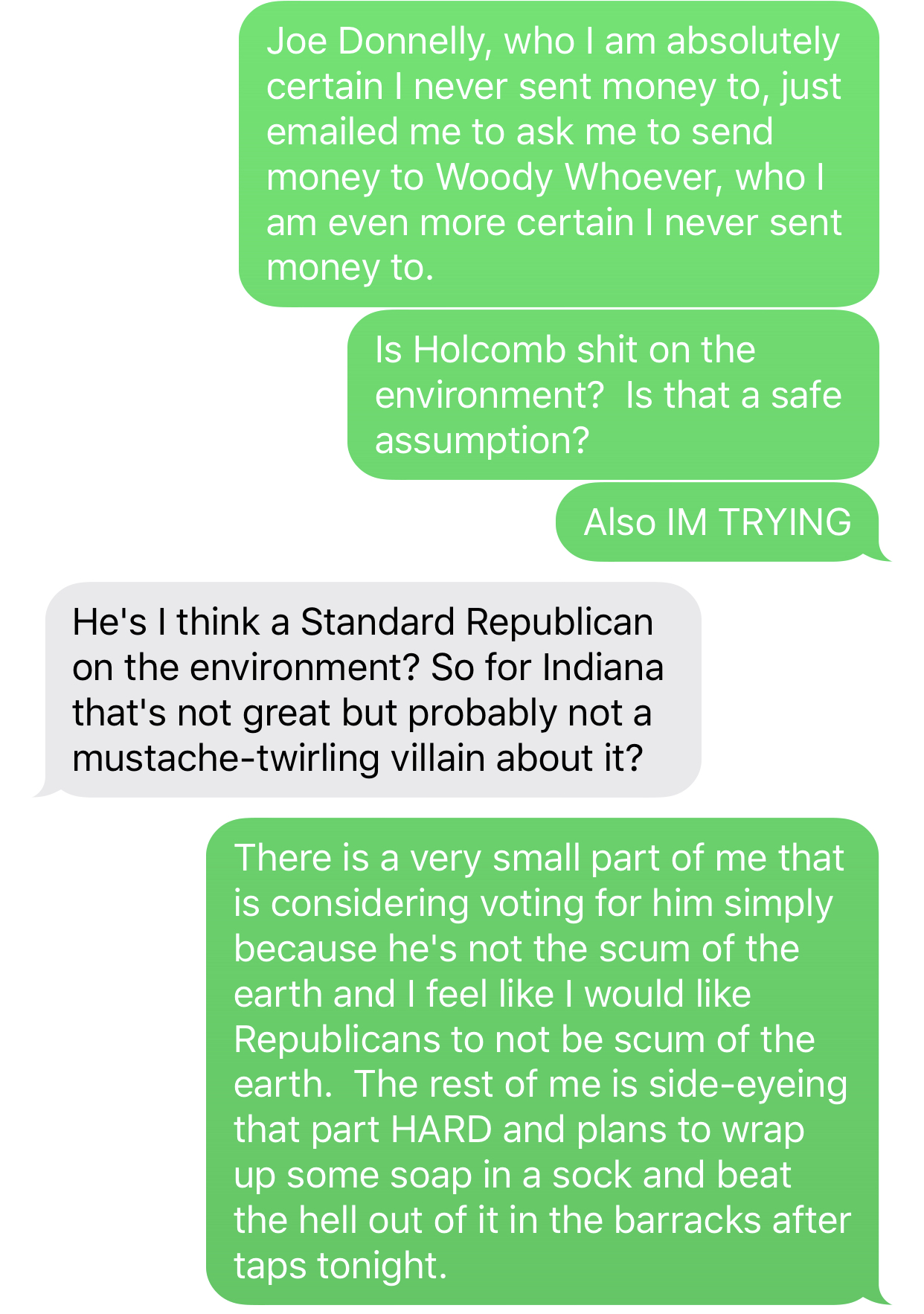 For context, Woody Whoever’s last name is not Whoever and he is running for Governor as a Democrat, and he is running such a low-key, bullshit campaign that I literally didn’t know that there even was a gubernatorial race this year until seeing his name on my primary ballot. I do not at this time remember his last name and I’m not about to look it up. I did some quick research before I marked his name on the primary ballot (not that it would have mattered, as he was the only candidate) and he seems basically competent, but Gov. Holcomb is one of the few Republicans I’m aware of who I would also describe as “basically competent.” He’s shit on education, but so is everyone else in the damn world. Obama was shit on education. I’ve voted for one candidate who was good on education policy in the last fifteen years or so and she turned out to be a shitty politician and got voted right out again after her first term. It just doesn’t happen that damn often.