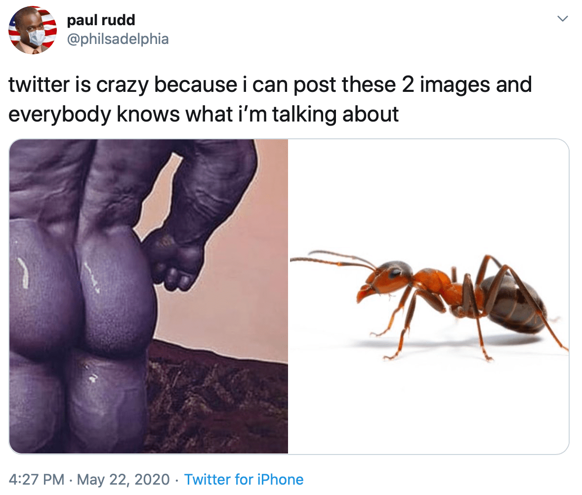 And I horribly disappointed her by not having the slightest idea what the hell could possibly be going on. Apparently– and you’re just going to have to believe me on this, as I refuse to look for it– there has recently been a discussion on The Twitter about why Ant-Man didn’t simply defeat Thanos by crawling inside his asshole and then growing.
