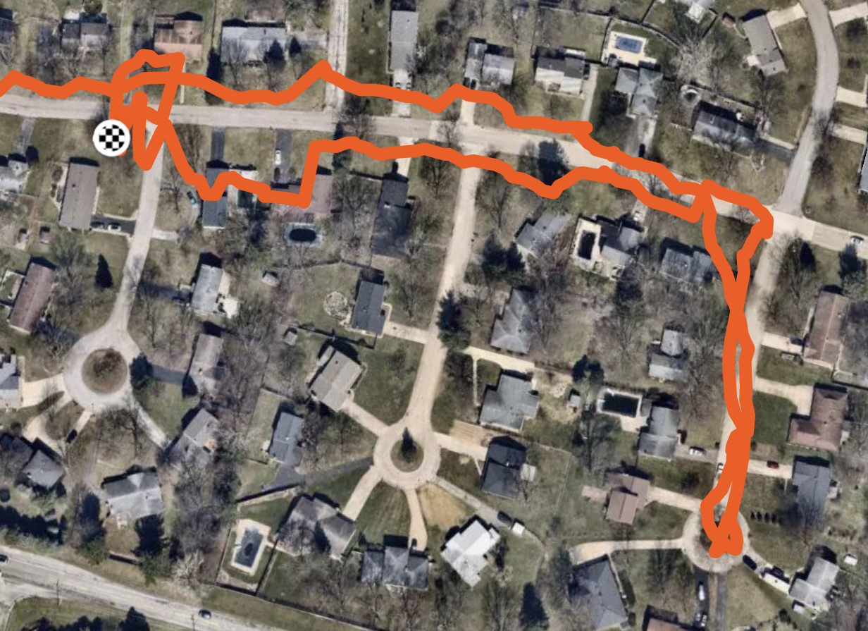 Now, it didn’t go as comically poorly as the diagram above seems to indicate– at no point was I off the road, and I certainly did not drive my Goddamned bike right through anyone’s houses, as the orange line seems to imply. There was no corner-cutting through lawns or anything like that. I don’t know why the line isn’t smoother, but it does more or less represent the route.