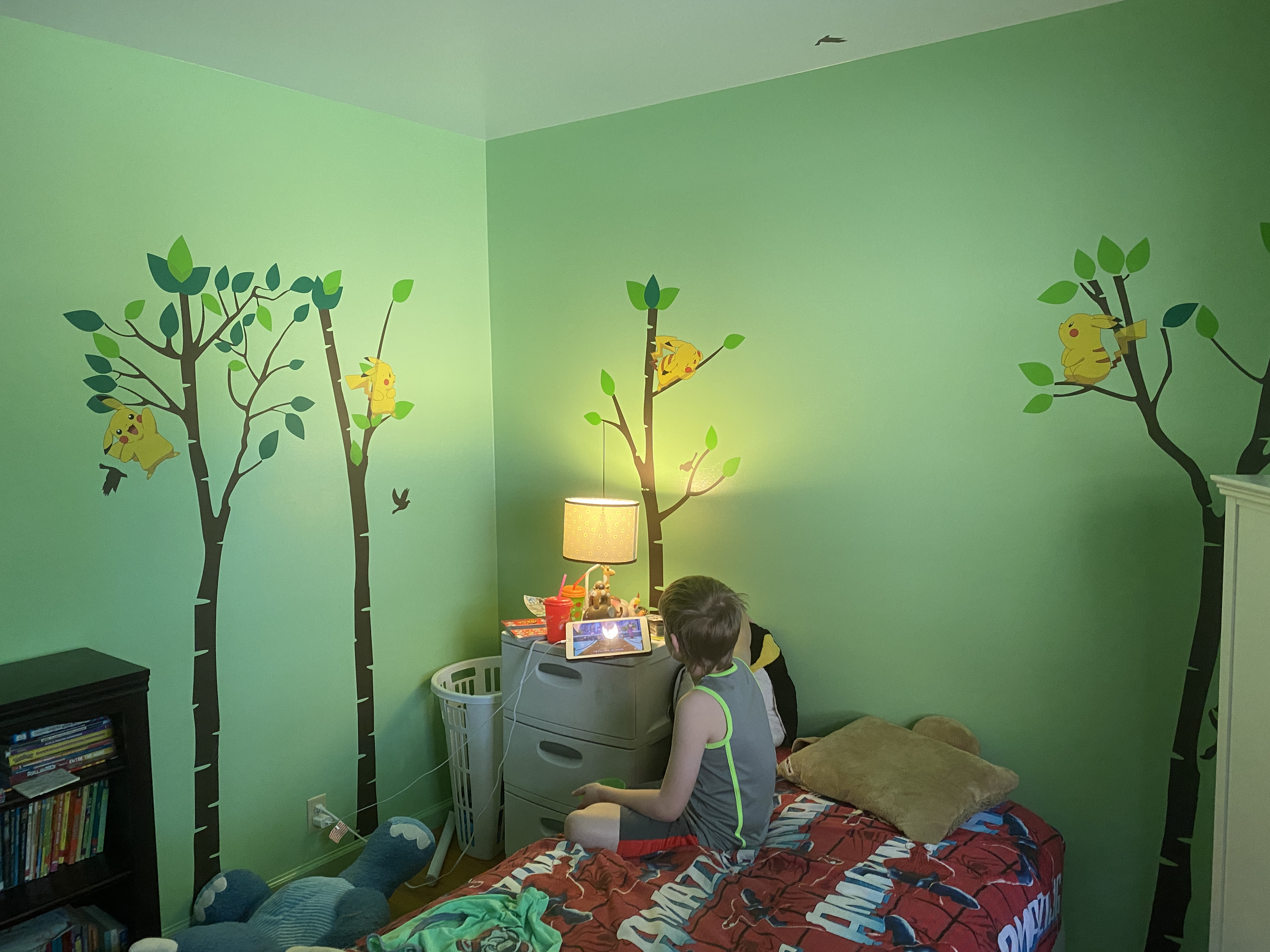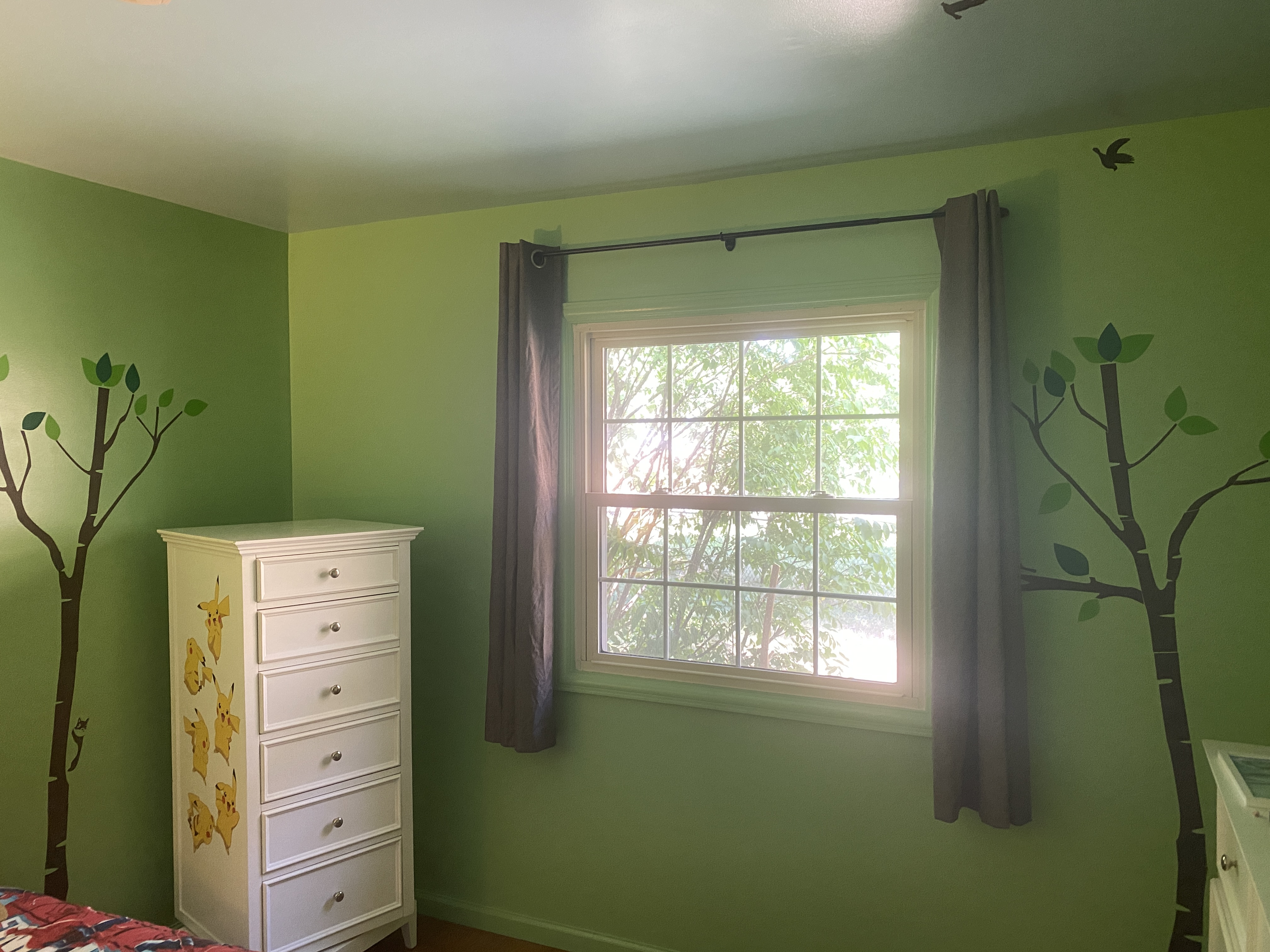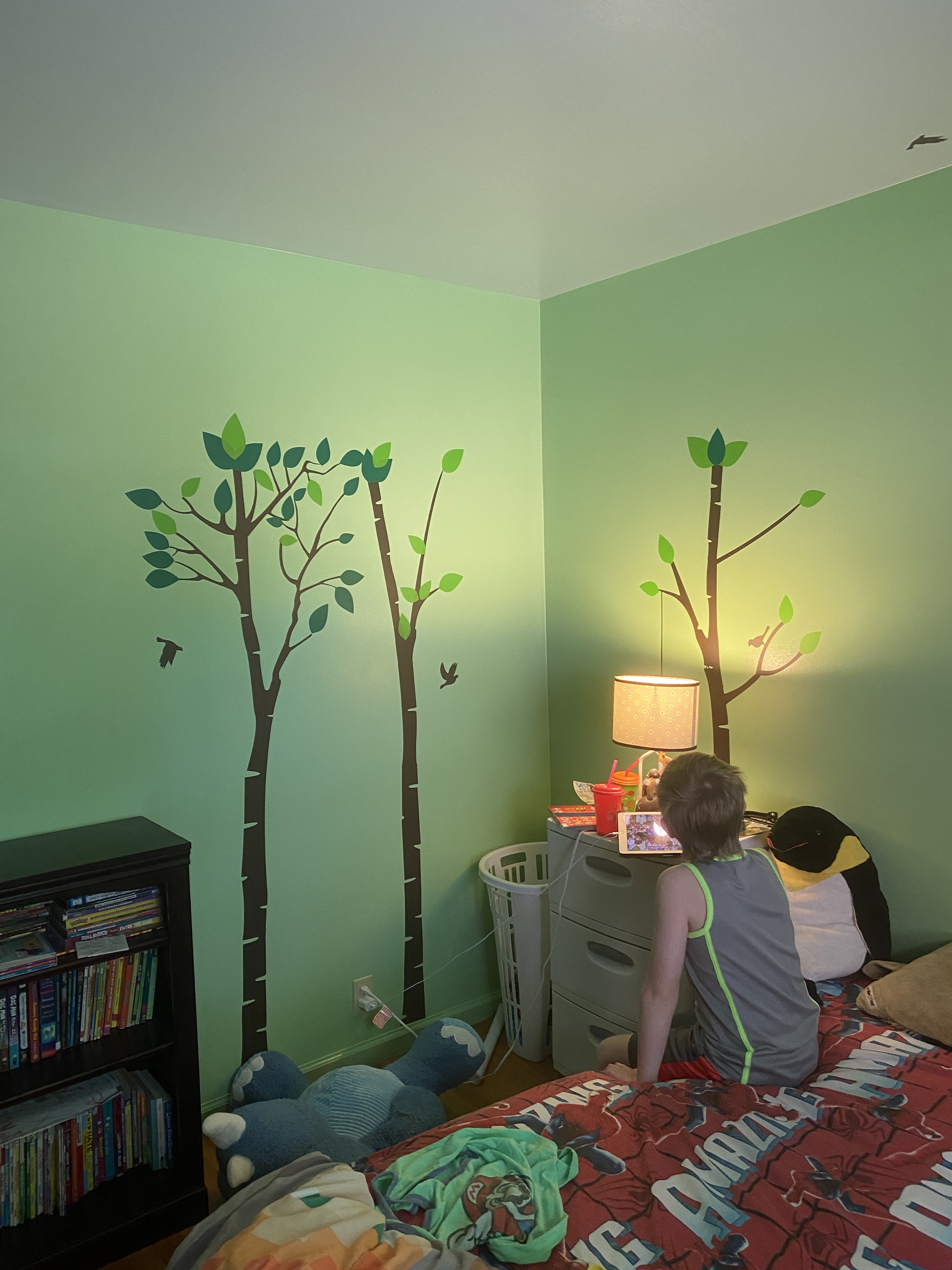 The other corner, with a couple more of the trees. We bought him a new bed– I managed to destroy his old bed frame, don’t ask– but it won’t be here until September so for now the box springs and mattress are just on the floor.