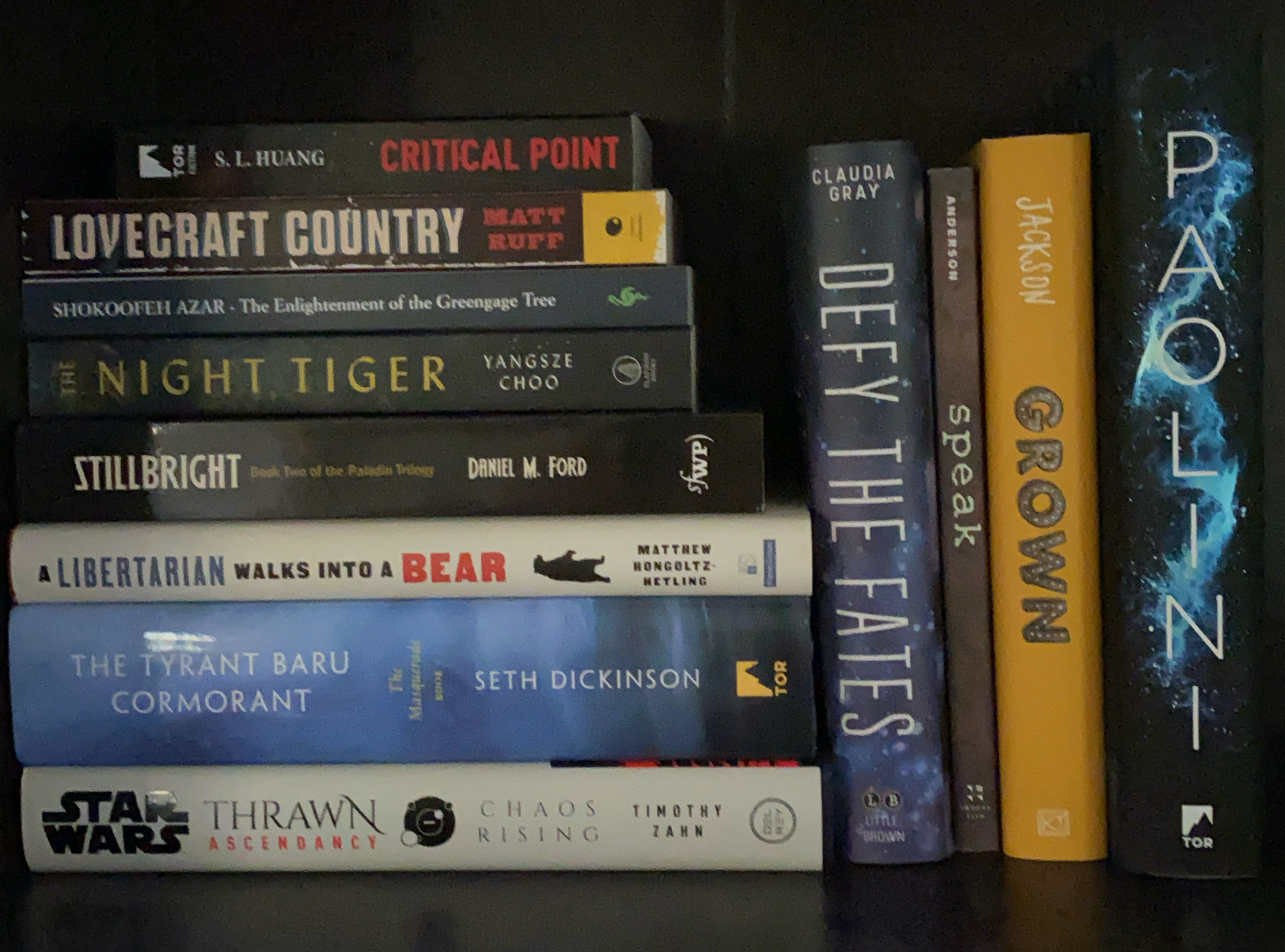 Technically, this could be my final update if I wanted to– my goal for the year was to read 52 books by women of color, and while I’m not finished with A Song Below Water, it’s been chosen as the 52nd book and it won’t take to the end of the month to finish it. But there’s still two months in 2020 (God help us all), and five authors– S.L. Huang, N.K. Jemisin, Silvia Moreno-Garcia, and Rin Chupeco– were represented twice. There’s also a new book by S.L. Huang on my unread shelf right now. So I figure the new goal is 57 books by 52 women. And after that I might go ahead and get started on 2021’s goal of reading books from as many different countries as I can.