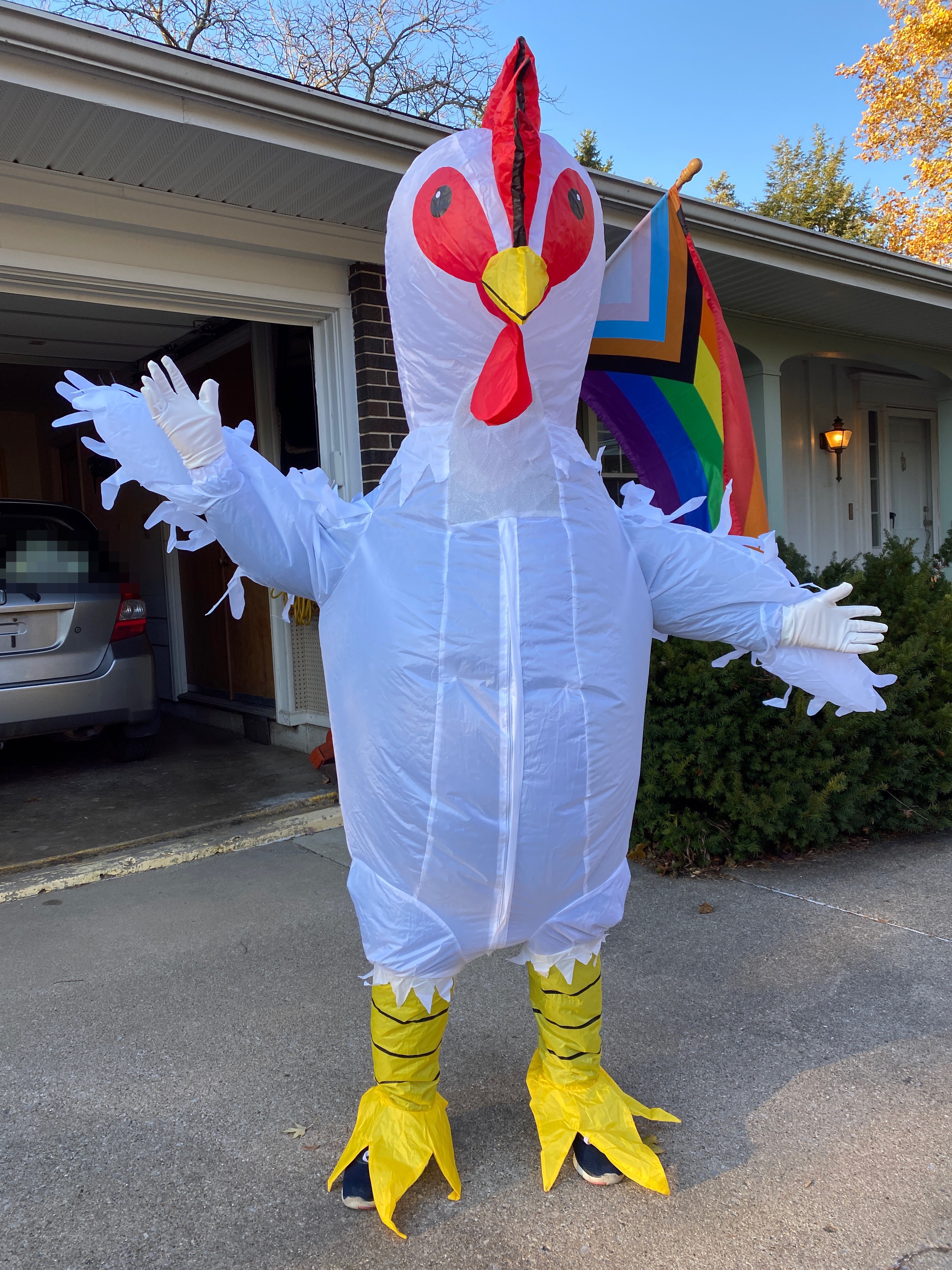 We went out and got the boy’s Halloween costume yesterday, as I said. He’s dressing as a giant chicken, for some reason. The costume is hilarious but I would never have guessed that he’d have picked it. As I’ve said, I traditionally dress up and pass out candy in the driveway, because we’ve always had either escape-adjacent or doorbell-hating pets, and frankly I can do without hearing the Goddamn thing all night myself. I have a go-to costume, but I wanted to do something different this year.
