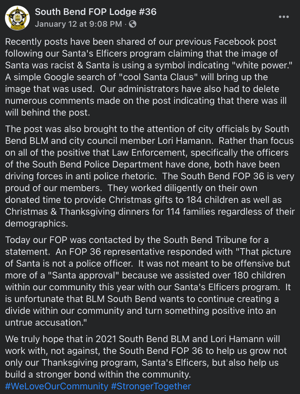 The South Bend Fraternal Order of Police, Lodge #36, recently posted this image to their Facebook page: