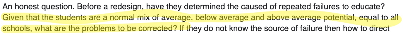 The point is, one way or another, those 45 kids would still be passing at my school. But they’re not. They’re passing at some other school, and instead I’m expected to produce average or better results– because no school can ever be below average, even though that’s mathematically impossible, all of our children must be above average– with the bottom 80% of the students.