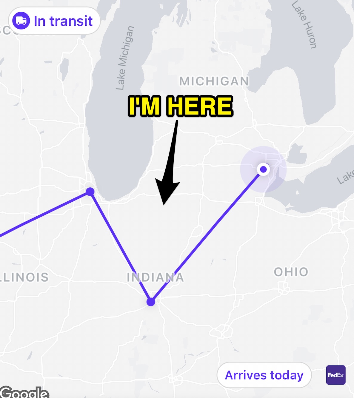 I assume that you will not look askance upon me if I reveal that I find this fact moderately frustrating. There is nothing especially important in the package; it’s not, like, insulin or something, and I’m not being harmed by having to wait an extra day or two for it. But if it’s in Chicago the day before it’s supposed to be in South Bend and you know that for some reason it has to go to Indianapolis and then to Detroit before coming to South Bend, which is in between Chicago and Detroit, maybe you update your scheduled arrival then? And then maybe don’t keep insisting it’ll arrive by 2:45 on that day right until the moment where that is temporally impossible?