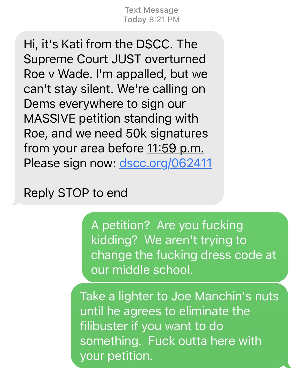 Probably shoulda just typed STOP, as Kati-from-the-DSCC never responded and likely also wasn’t actually a person, but whatever. A fucking petition. No, I’m not signing a petition. Petitions are for twelve-year-olds. Nothing that mattered has ever been changed by a Goddamned petition.