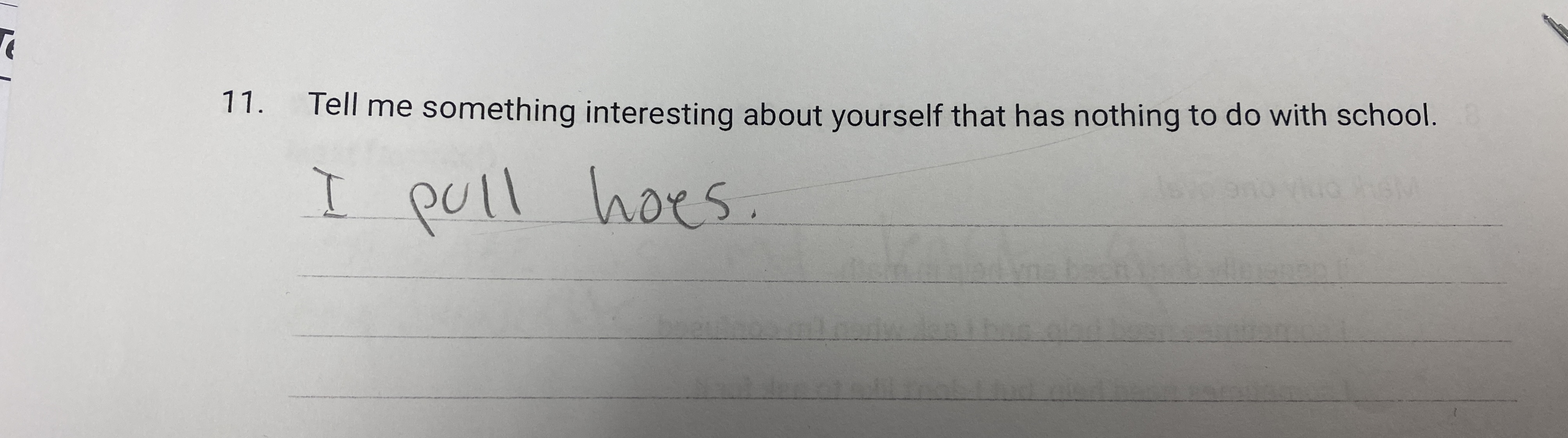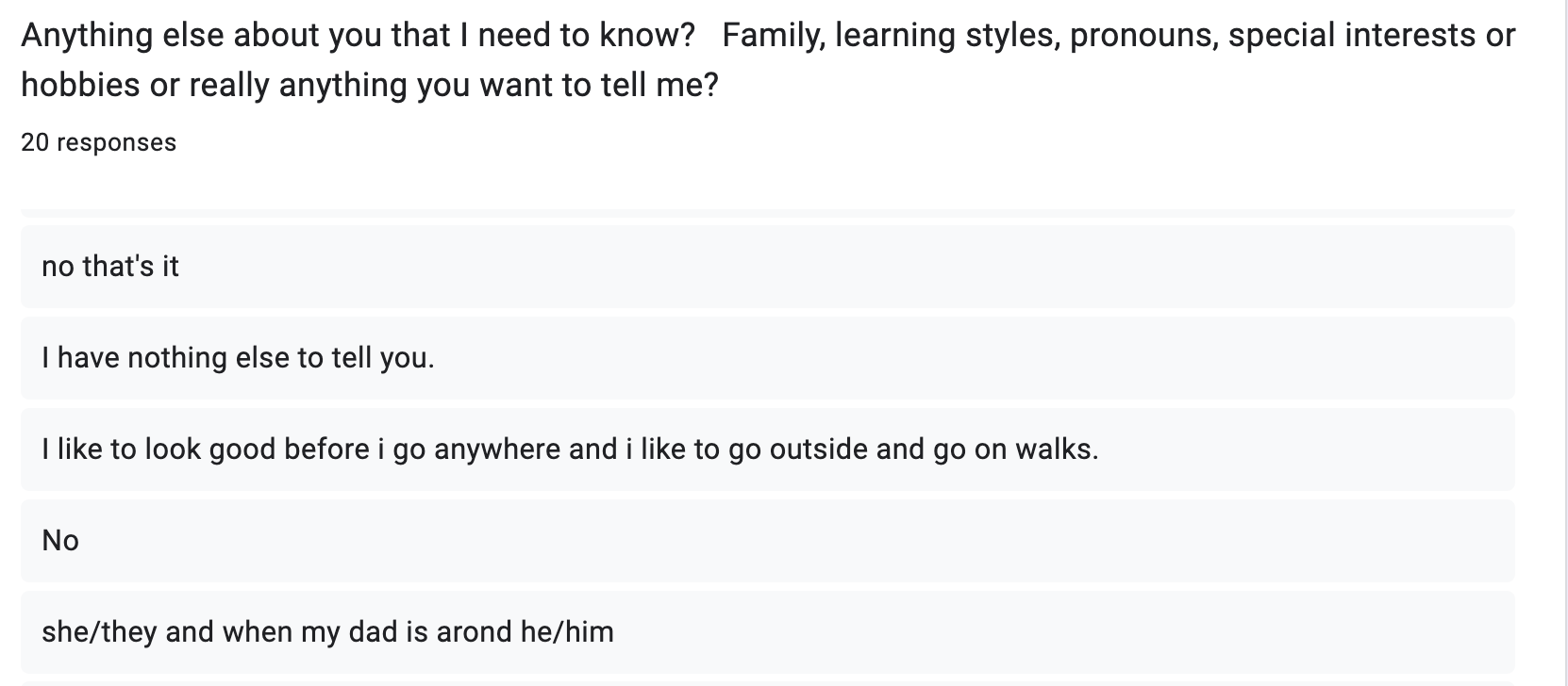 I’ve also set a new record for kids who made sure to let me know on the first day of school that they are somewhere on the LGBTQIA+ spectrum, including this one (look at the bottom answer):