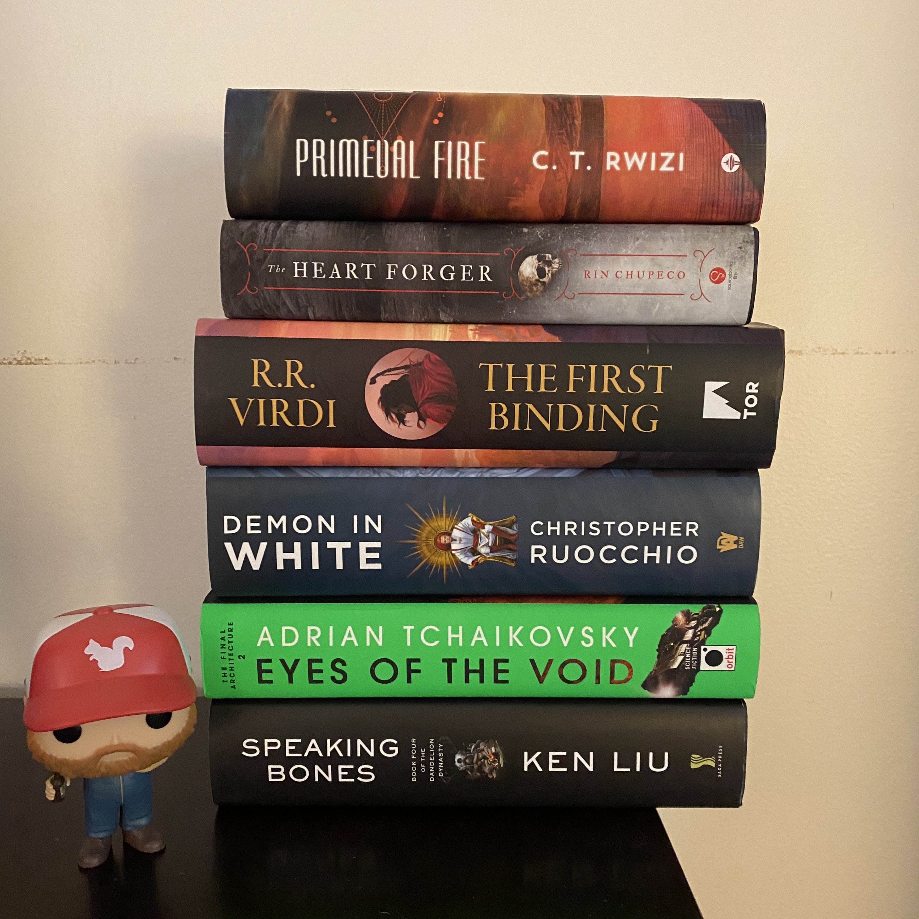 Six books, all from my Unread Shelf, next to Squirrelly Dan for scale. Which book has the most pages, and which has the fewest? The answer may surprise and enthrall you!