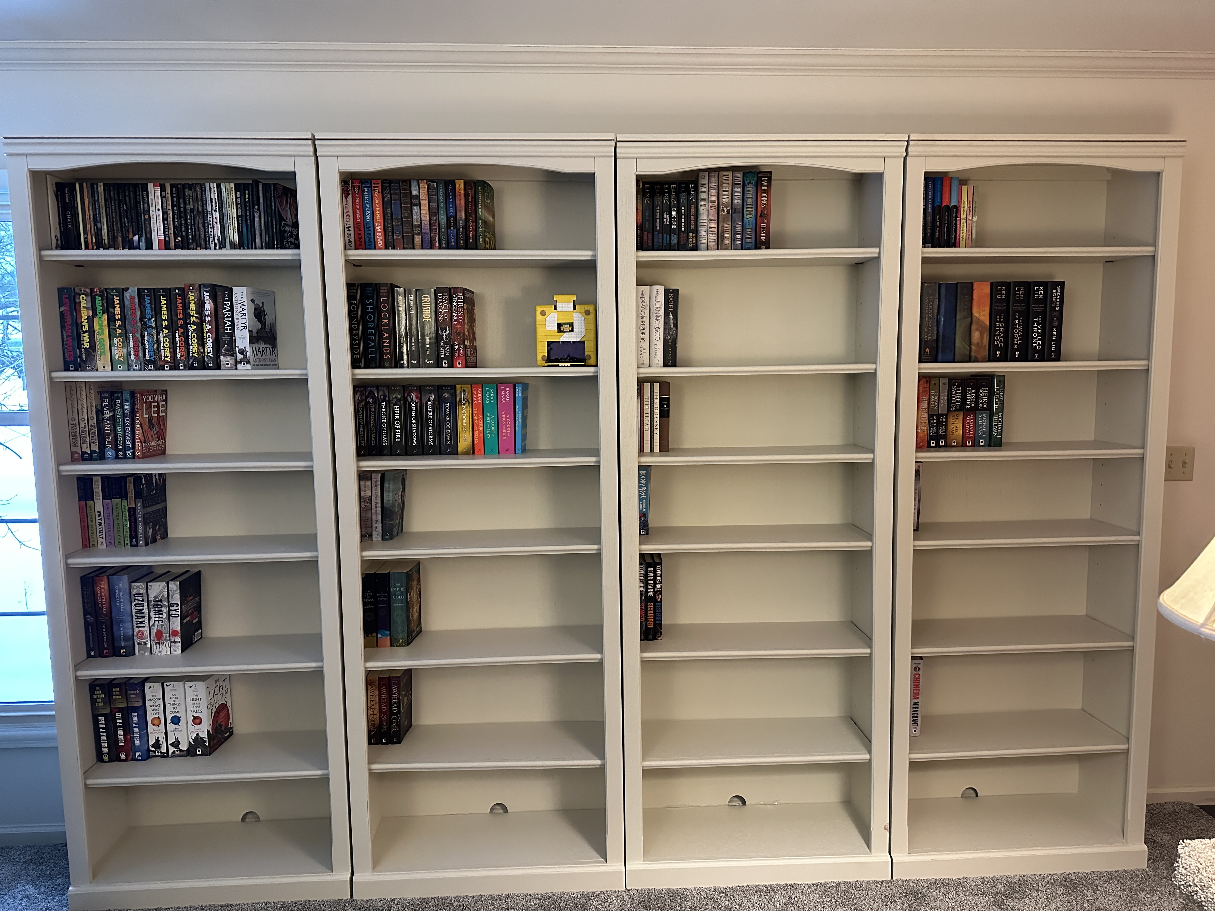 I have had a plan to replace the bookshelves in the living room— now, if you’ll recall, in the room that used to be the dining room– with higher-quality, real wood, 7 foot bookshelves for literally as long as I’ve lived in this house, and 2022 has been the first year in a long time that wasn’t utter shit, so we finally have the money to invest in something that’s going to last: thus these four new shelves, which magically match the paint in the living room perfectly and are finally going to give my books some breathing room.