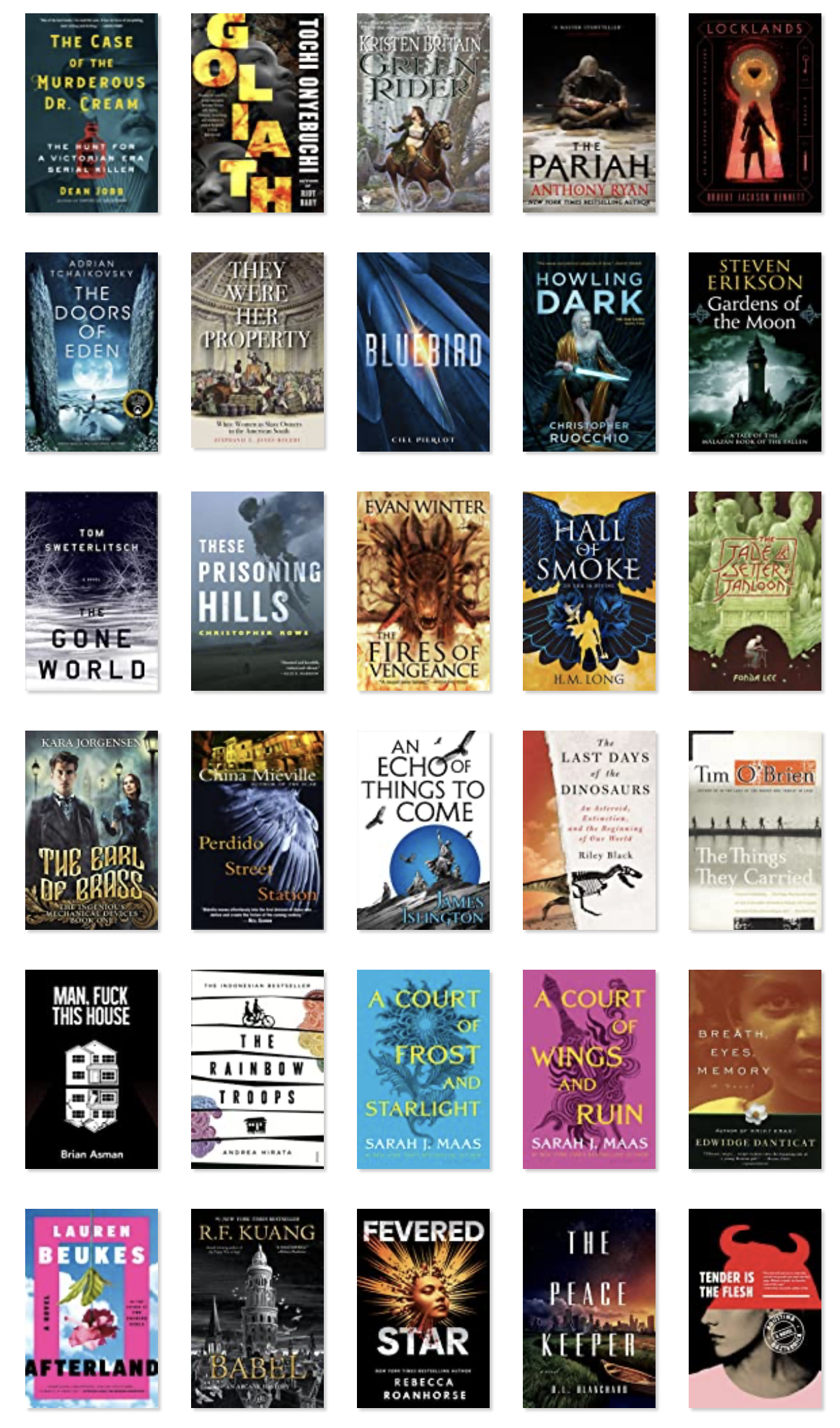 Honorable Mention, in No Particular Order, Except for One Book: The Last Days of the Dinosaurs: An Asteroid, Extinction, and the Beginning of Our World, by Riley Black; Kings of the Wyld and Bloody Rose, by Nicholas Eames, which you should understand as the unofficial #11 on this list; The Case of the Murderous Dr. Cream: The Hunt for a Victorian Serial Killer, by Dean Jobb; Leviathan Falls, by James S.A. Corey; Under the Whispering Door, by T.J. Klune; Six Crimson Cranes, by Elizabeth Lim; Bluebird, by Ciel Pierlot; The Architect’s Apprentice, by Elif Shafak; The Doors of Eden, by Adrian Tchaikovsky; The Rage of Dragons, by Evan Winter; and Scythe, by Neal Shusterman.