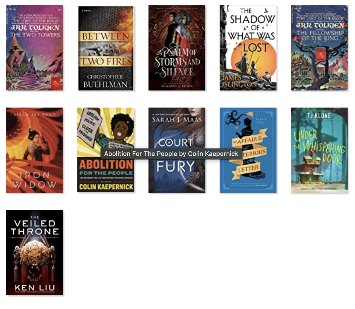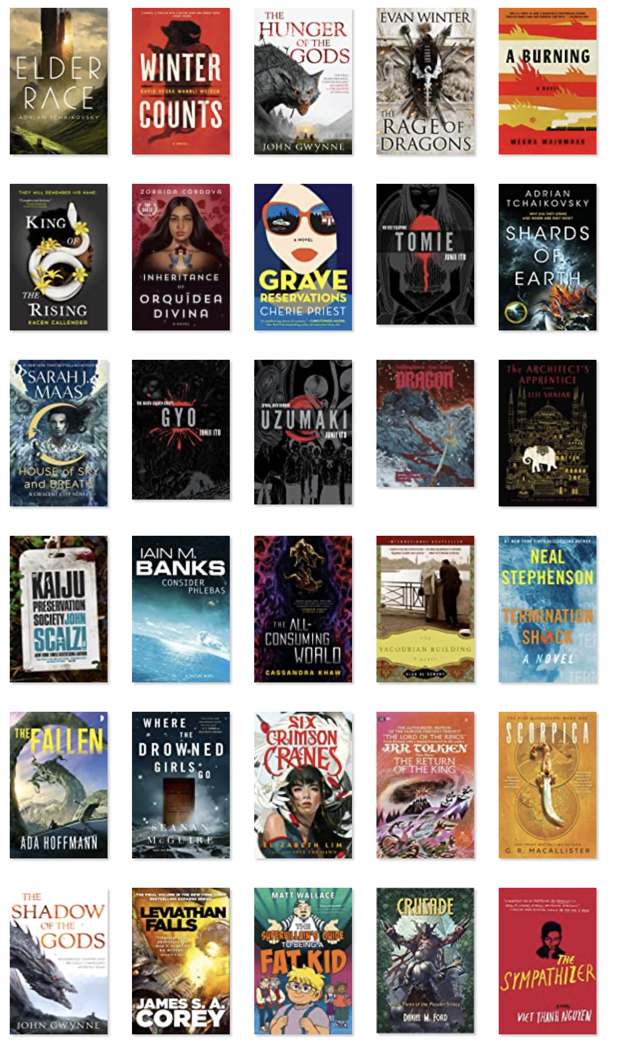 I read four books each by Adrian Tchaikovsky and Sarah J. Maas, three by Junji Ito and J.R.R. Tolkien (and I really should have gotten to the Silmarillion this year, and didn’t) and two each by Rin Chupeco, Nicholas Eames, John Gwynne, James Islington, Kara Jorgensen, Cassandra Khaw, Elizabeth Lim, Christopher Ruocchio, Anthony Ryan and Evan Winter.
