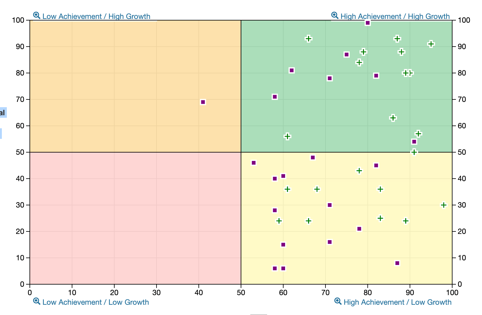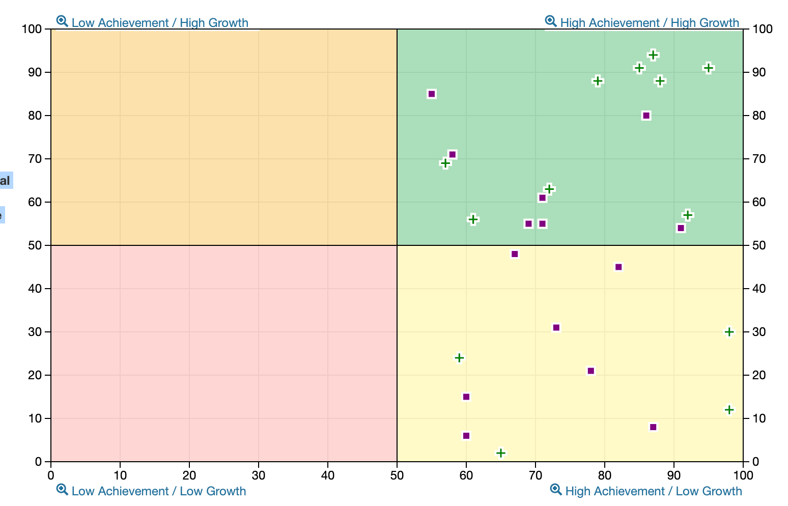 This is my first hour class. The plus signs are Math and the squares are LA. Now, you’d expect everybody to be to the right on the “achievement” part of the graph, since they’re honors kids, but there’s nothing about honors classes that guarantees high growth, and compare how high the pluses are to how high the squares are. It’s even more stark in sixth hour: