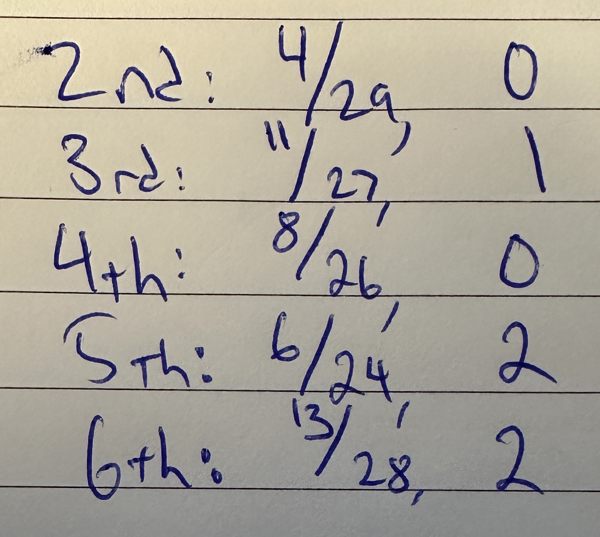 I’d say a third of those kids got their grades up to passing during their math classes on Friday, and another third will be up to snuff by the end of the weekend. The rest will require some more individual work. But most of my classes this year haven’t had more than one or two kids failing, and I’ve seen more than one, miraculously, where at the end of the quarter every single student was passing. So they’ll fix it. And then fourth quarter I’ll have to scare the shit out of them all over again.