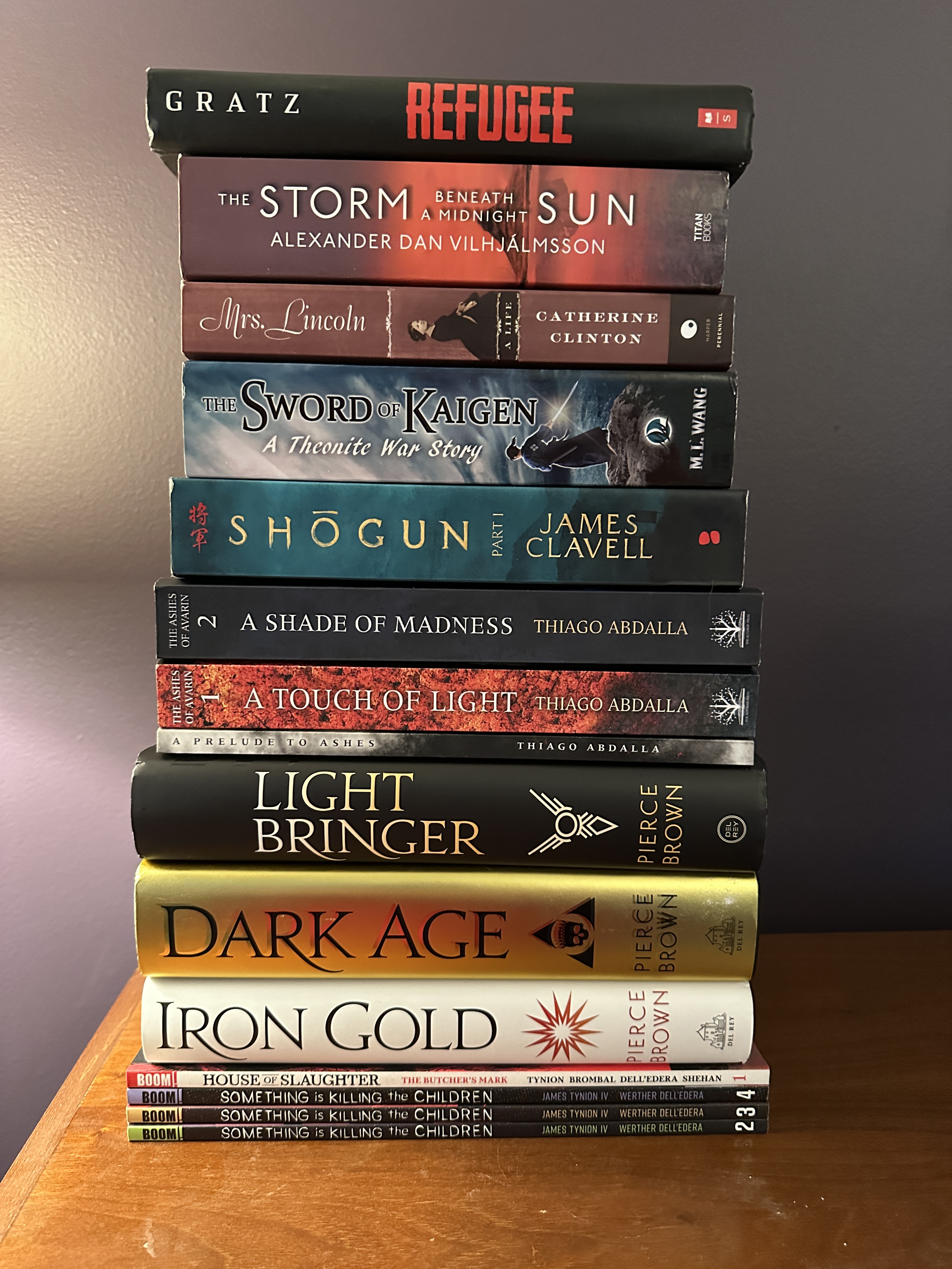 Book of the Month is Pierce Brown’s Dark Age, although I could probably just say “The second Red Rising trilogy” and be done with it. Also, this is clearly an entire shelf of books all by itself and how the hell are there still so many unread books.