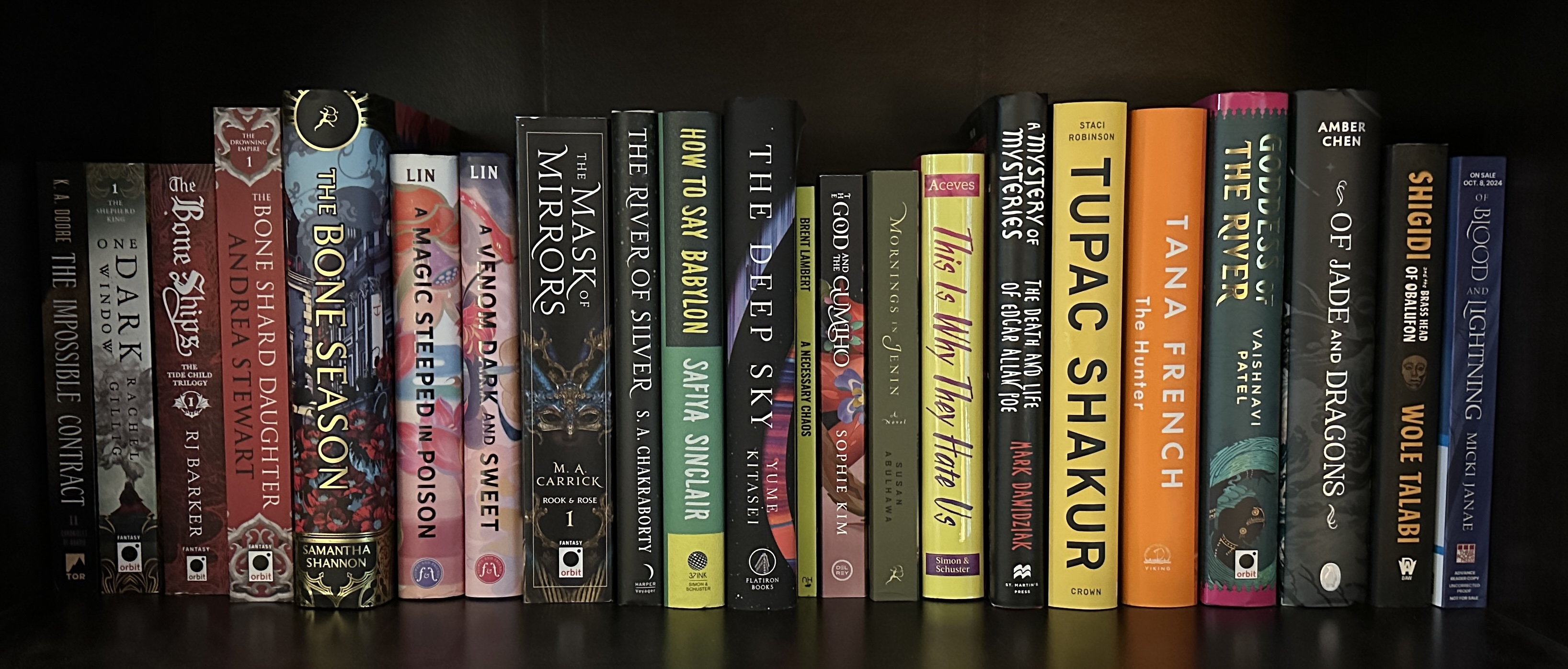 You’ll notice two things about this image: first, that none of these books were on the shelf last month, and second, that I have obviously dropped my “don’t buy new books unless they’re part of a series I already have” rule entirely as of June. Also, there are three different books on the shelf with the word “bone” in them, which entertains me quite a lot.