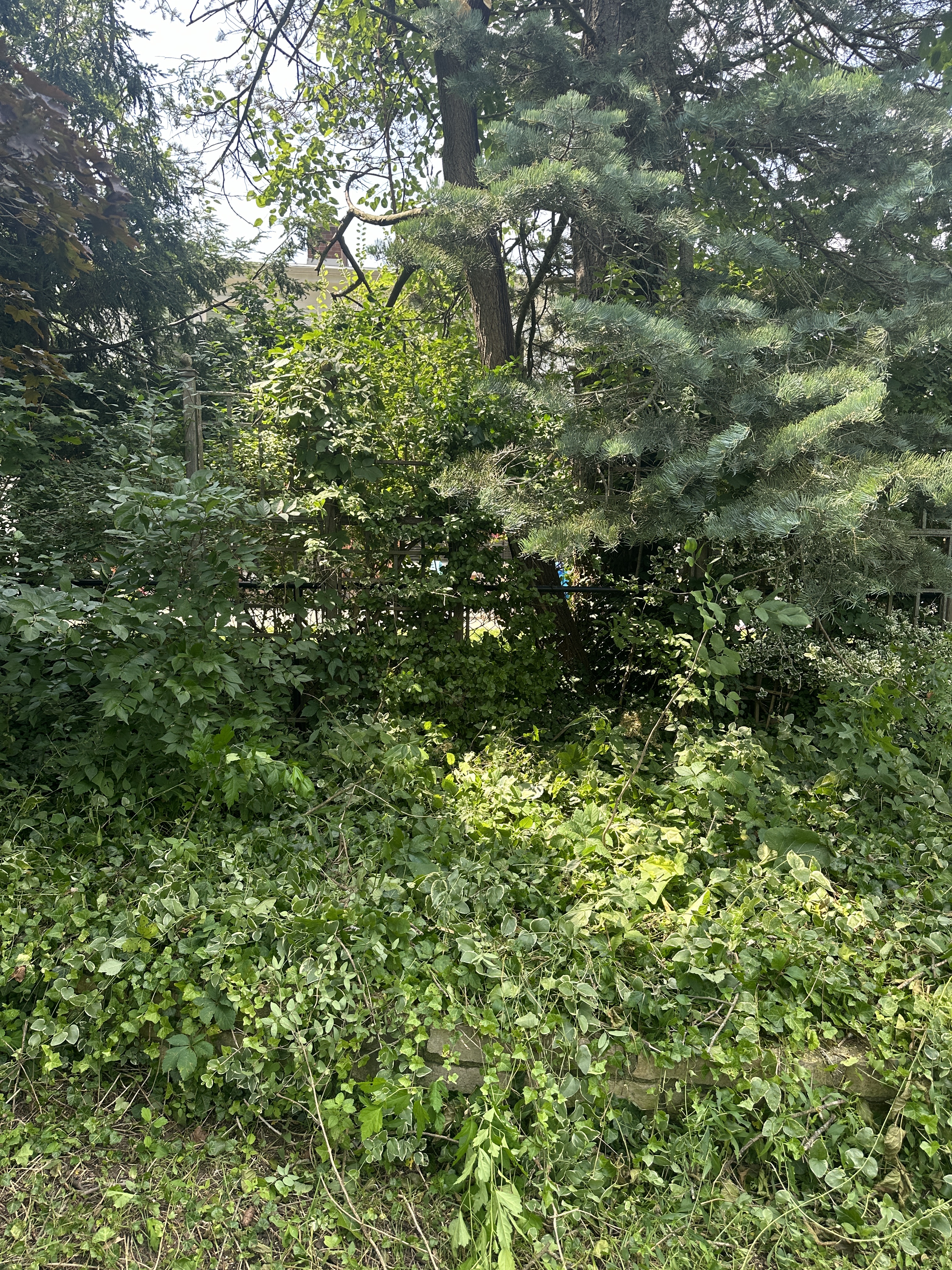 What you are looking at is the foliage in between our house and the house behind us. There’s a fence buried in there, and until yesterday there was a shitton of broken branches as well. That tree that is more or less in the center of the picture lost a couple of big branches during a storm last week, and while the tree itself is in their yard, the branches all landed in ours.