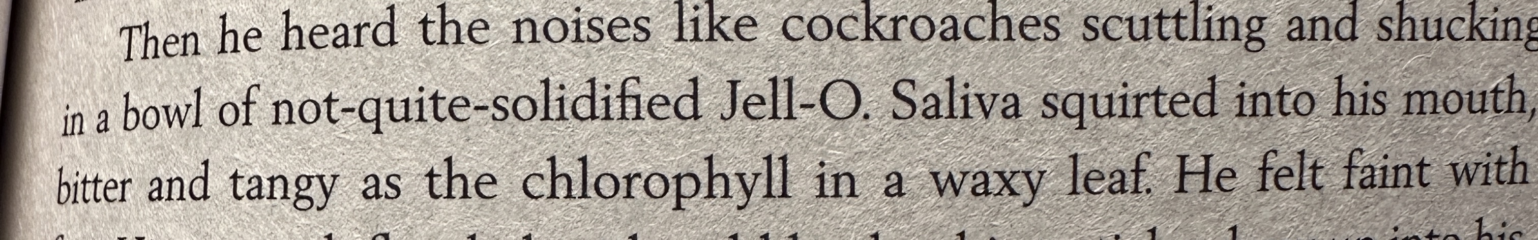 Is … is that what the sound sounds like? Like cockroaches “scuttling and shucking,” a phrase every middle schooler uses all the time, in a bowl of semisolid Jell-O? Are you fucking serious? And then, in the next sentence, the saliva in his mouth tastes not like the already-too-specific waxy leaf, but the chlorophyll in said waxy leaf.
