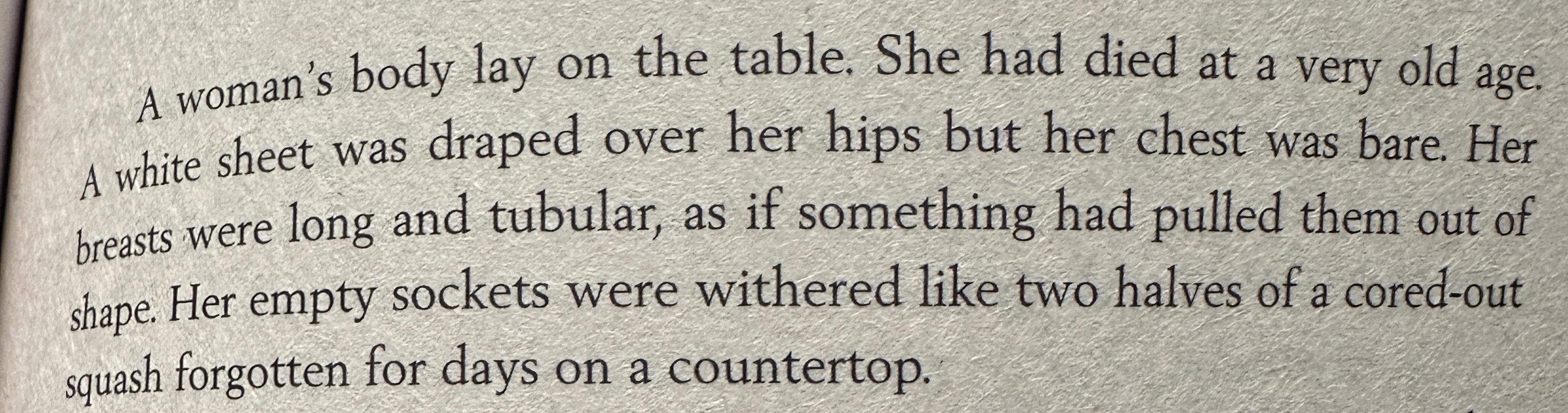 And for the second time in a row, this leads me into another complaint: every single metaphor and simile in this book sucks. Every single one. If you see the word “like,” you have some bullshit headed your way. Two halves of a cored-out squash forgotten for days on a countertop? Is what her eye sockets looked like? What the fuck?