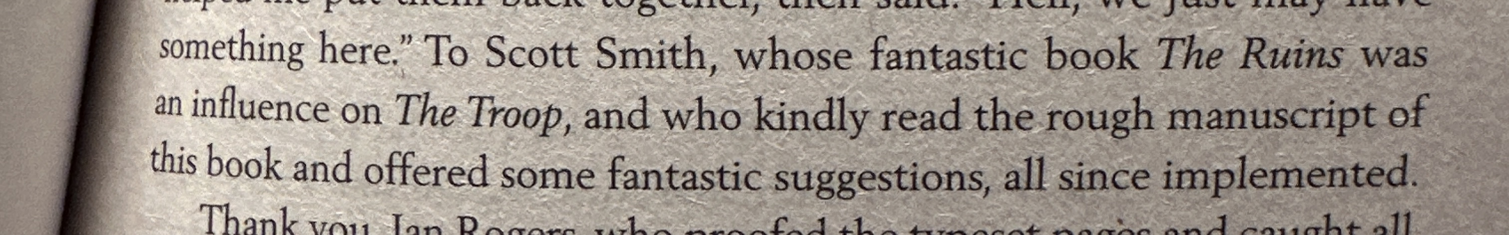 Guys, I could keep going on for so much longer. This book is so fucking bad. But let’s close with this: remember that third bad book I mentioned up there? It’s The Ruins, by Scott Smith. It’s awful in exactly the same way The Troop is. Upon finishing the book, and before reading the author’s afterward, I commented to my wife that the only books I could think of (at the time) that matched this one in terribleness were Swan Song and The Ruins. And then I encountered this: