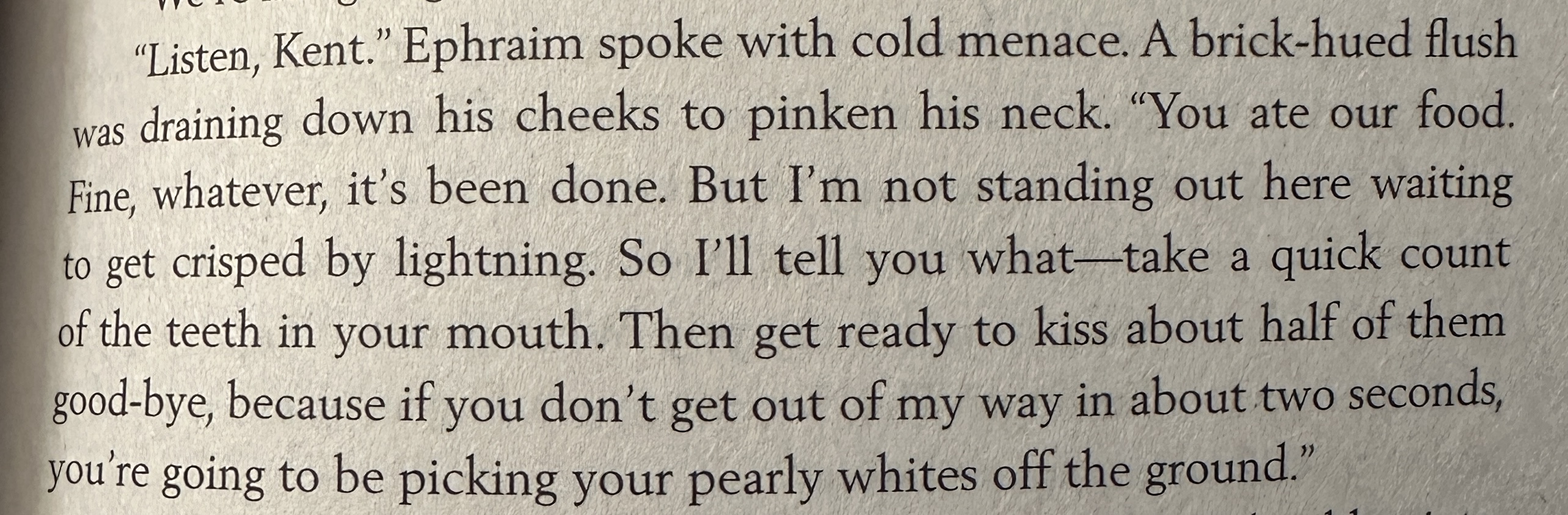 You might be thinking I’m nitpicking. I realize that. But I want to reiterate that there’s something stupid or fucked-up on nearly every page of this book, and after a while you just stop extending nonsense any grace.