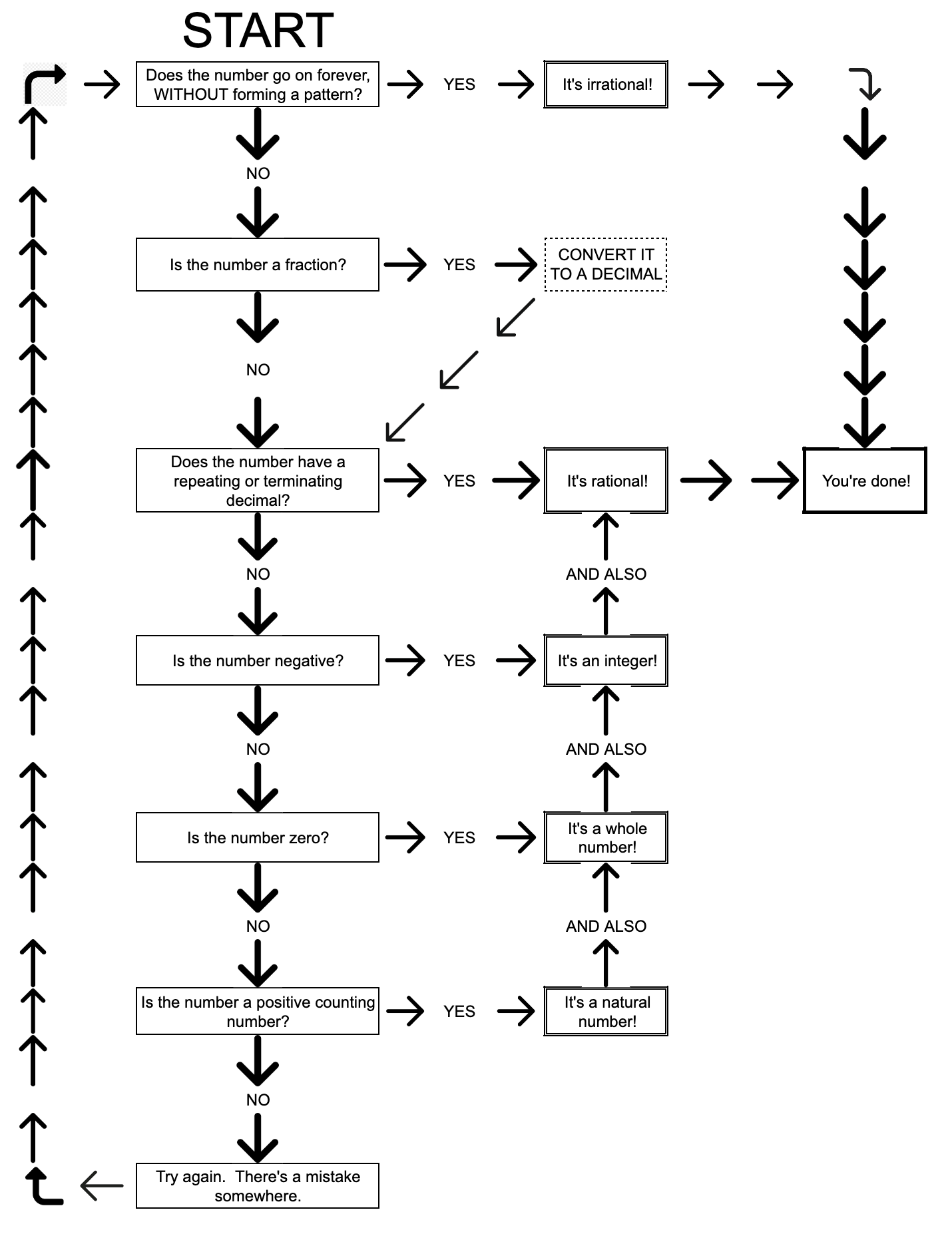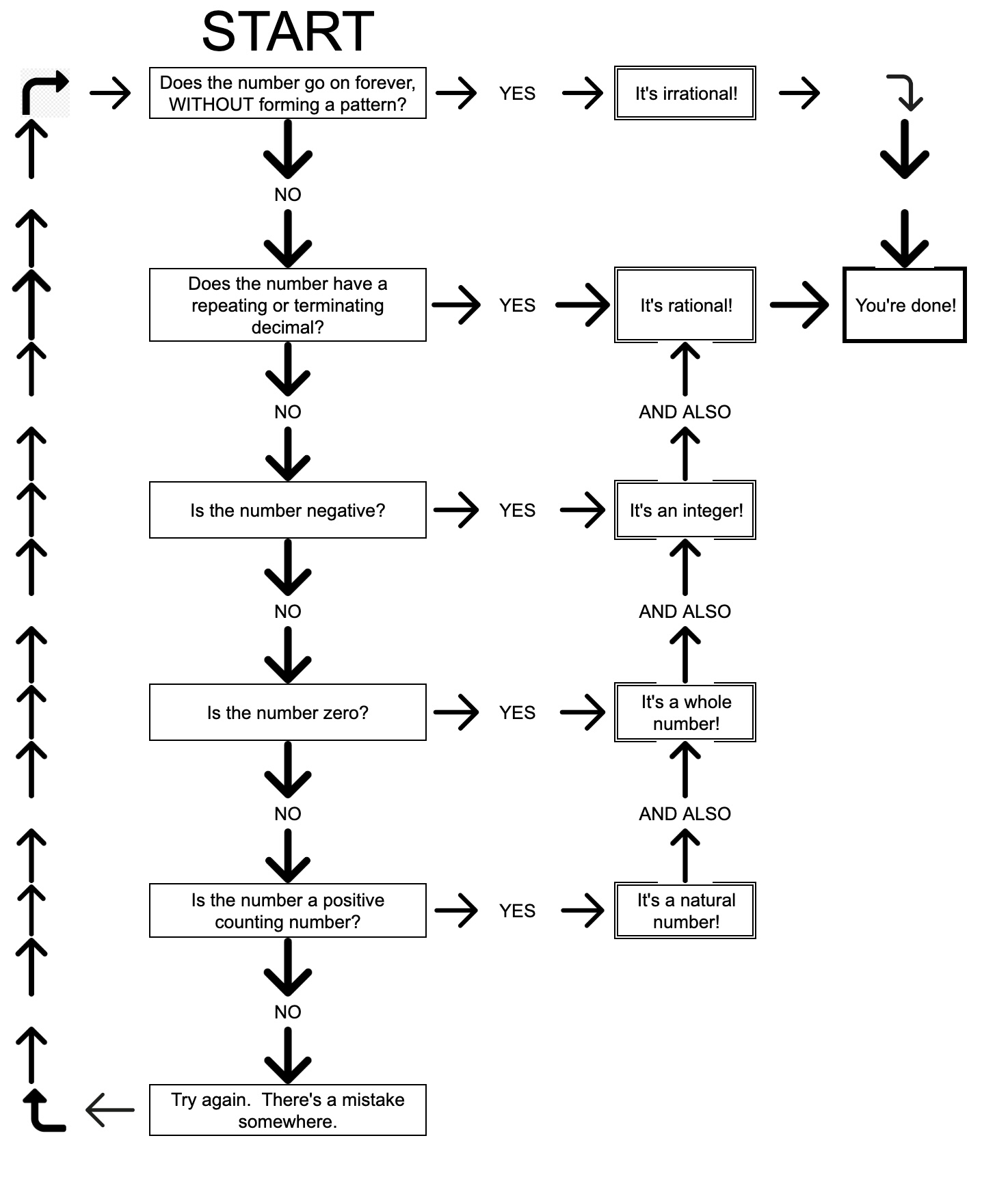 I am not a digital artist, as you can probably tell, and I put this together in Sheets, which is certainly really far from the best way to do it, but it gets the job done. Here’s the question: how do I best include the existence of fractions? Fractions are always rational, but depending on what the fraction is, it can be any of the rational number sub-categories as well. I could just include an instruction after the first question to convert fractions to decimals, but 1) that feels inelegant, and 2) it sort of introduces another source of error, but that source is there anyway, I suppose– a kid that doesn’t recognize 1/3 as a repeating decimal is probably also not going to realize that 12/4 is a natural number.