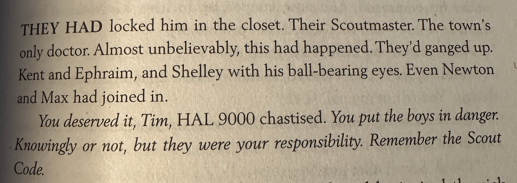 This one’s a twofer; we have bad writing (never complain about your own plot; that fourth sentence should have been snipped for redundancy and ridiculousness, and why the hell does it matter that he’s a doctor here?) and, while Tim is an adult and might have seen 2001, he’s younger than me, and thinking of his own inner monologue as HAL 9000 is just kinda weird.
