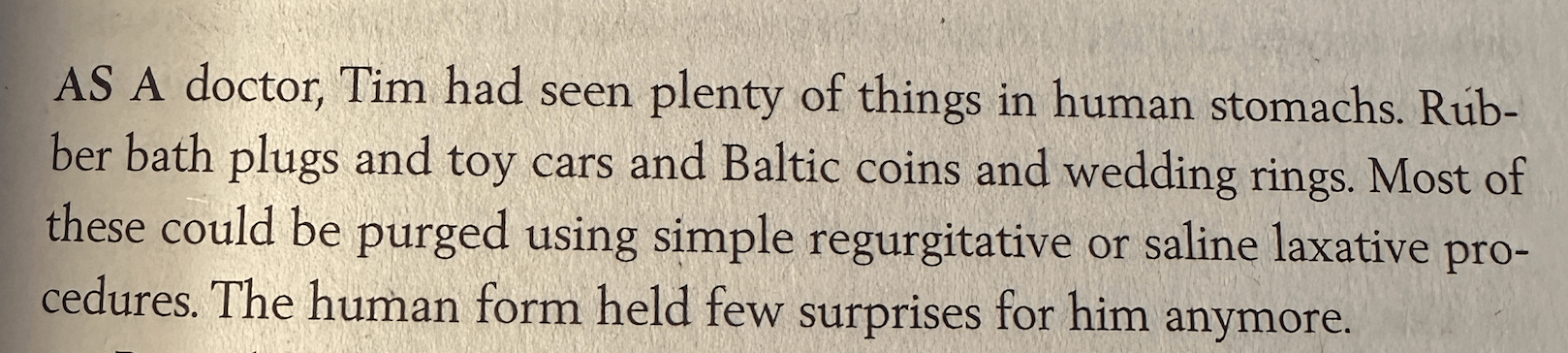 If you were to make a list of random objects that might be found by a, remember, small-town Canadian doctor in someone’s stomach, would rubber bath plugs be the first thing you mentioned? I have seen rubber bath plugs, and they are large, and not easily eaten. And Baltic coins? Specifically Baltic coins? Seriously? Not just … coins? No, we’ve gotta be less realistic than that.