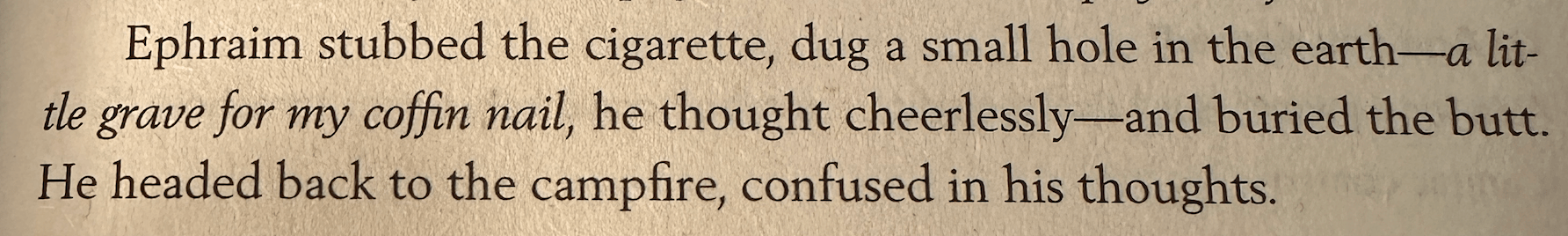 First, kids vape now. Second, no fourteen-year-old has ever described a cigarette as a “coffin nail.” Third, “confused in his thoughts” is shit writing.