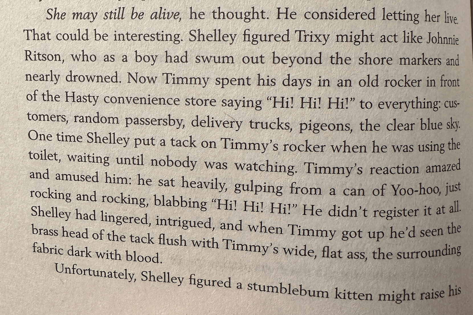 This paragraph is embedded in the middle of Shelley reminiscing about drowning his mother’s kitten, which is just super and goes on for a few pages, but do you see the problem here? Johnnie Ritson is Johnnie the first time he’s mentioned and then his name changes. Nobody caught it, and nobody stopped to suggest using the name “Timmy” for the disabled kid might be a little too on the nose.