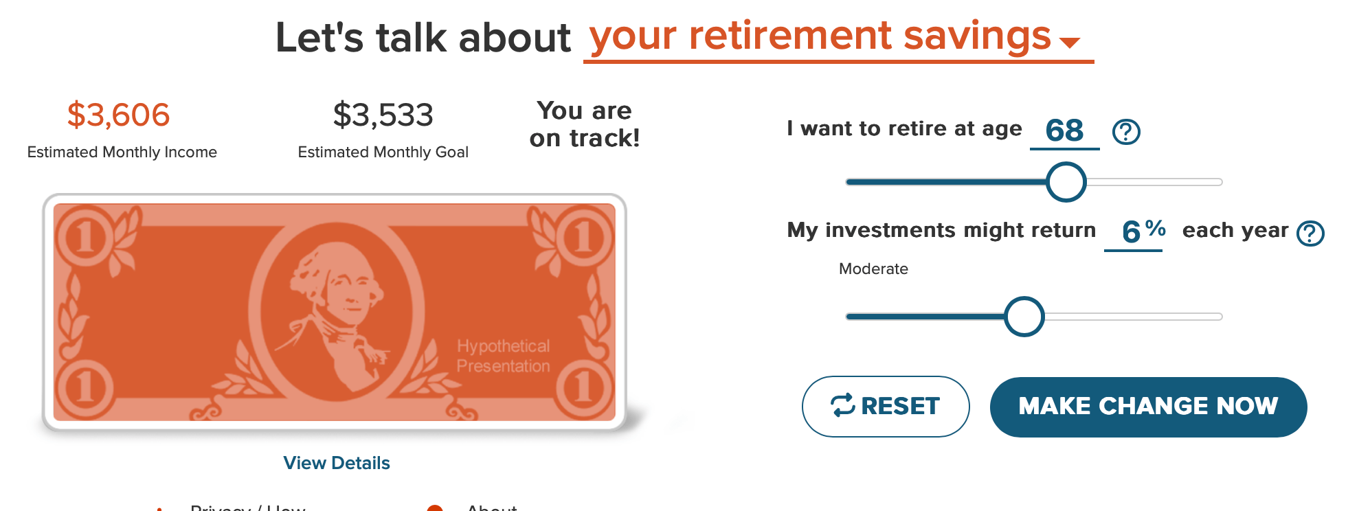68? Sixty-eight? Sixty-eight???? Shit, I’m not even going to be alive at 68 much less wait that long to retire. It turns out that if I play with that slider I can earn an impressive $55 a month if I retire next year, and the magic number appears to be 62, where the orange bar makes a big jump over to the right. That’s still fourteen years out, which feels kinda crazy.