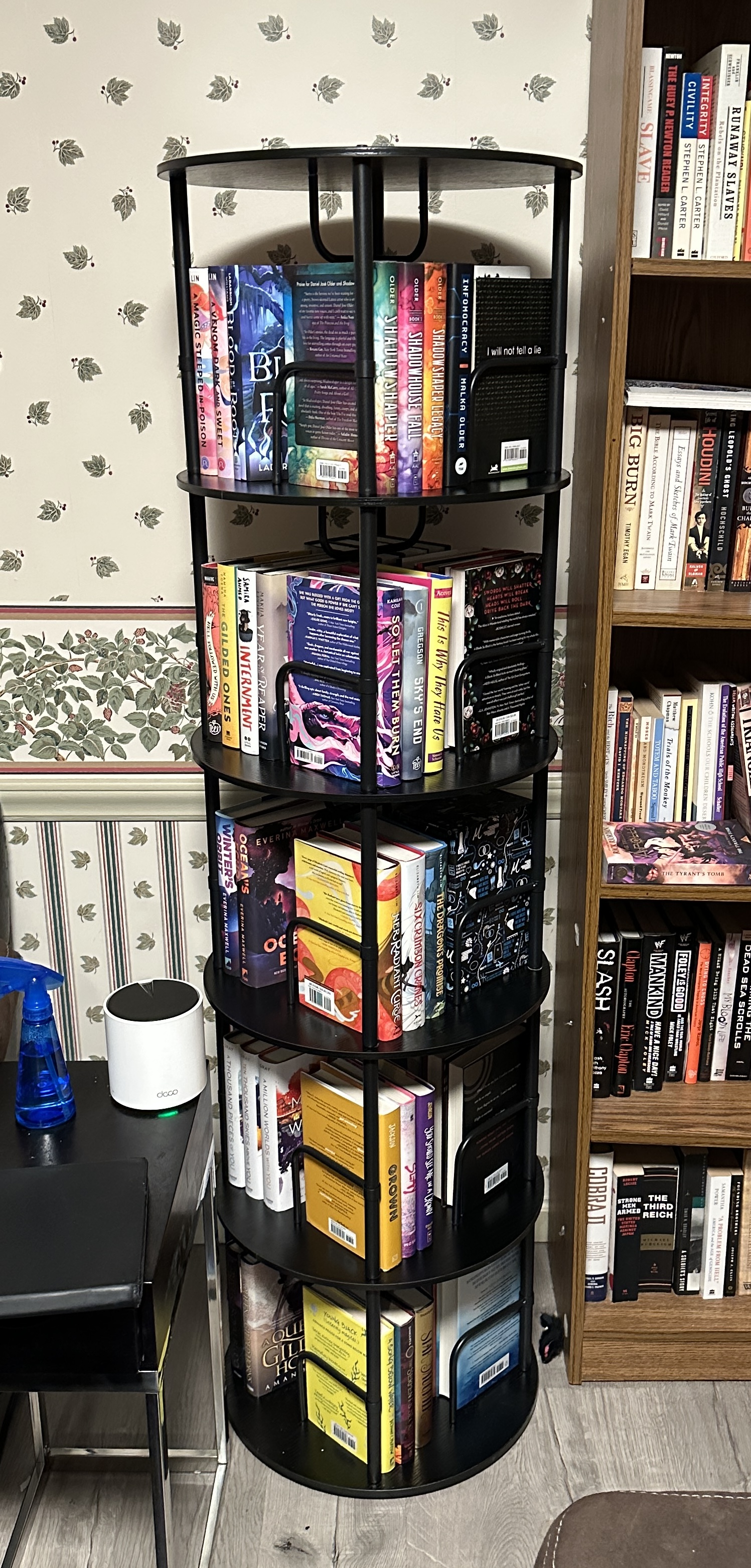 My sole accomplishment this weekend, if you want to grant it that status, was taking this spinning bookshelf out of its box (fresh from the TikTok shop!) and putting it together, which means that I now have this little spot for all of my YA books, or at least I have this little spot for all the YA books I have right now, because I’m going to outgrow it in about five more books. It’s pretty and colorful, though, and the fact that every book on there but one is exactly the same size grants it a really pleasing symmetry. I’ve said this before; there is a difference between being a reader and a book collector, and I am very much both of those things.
