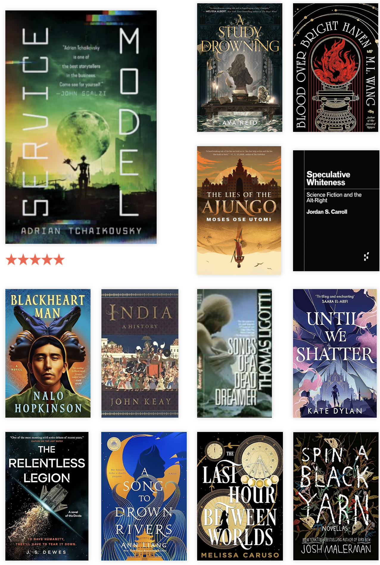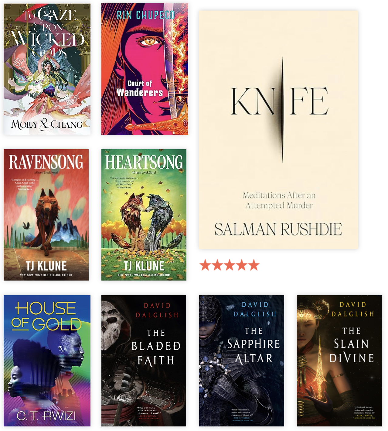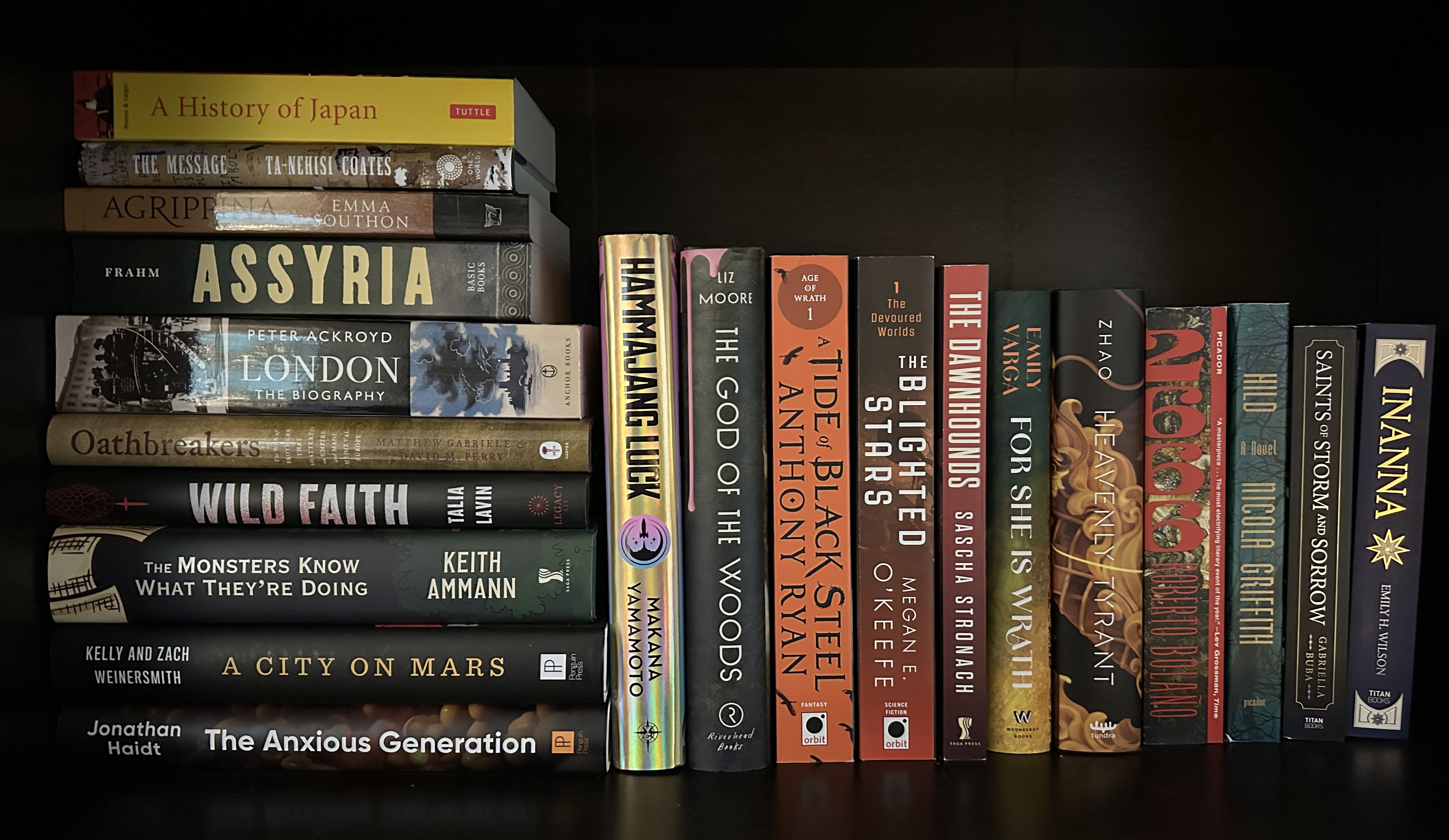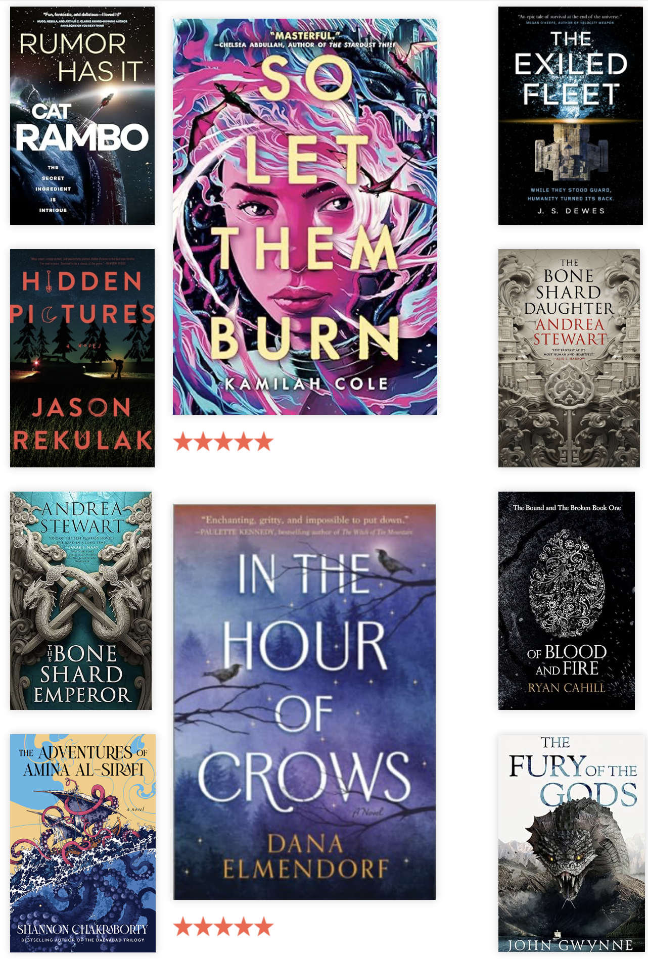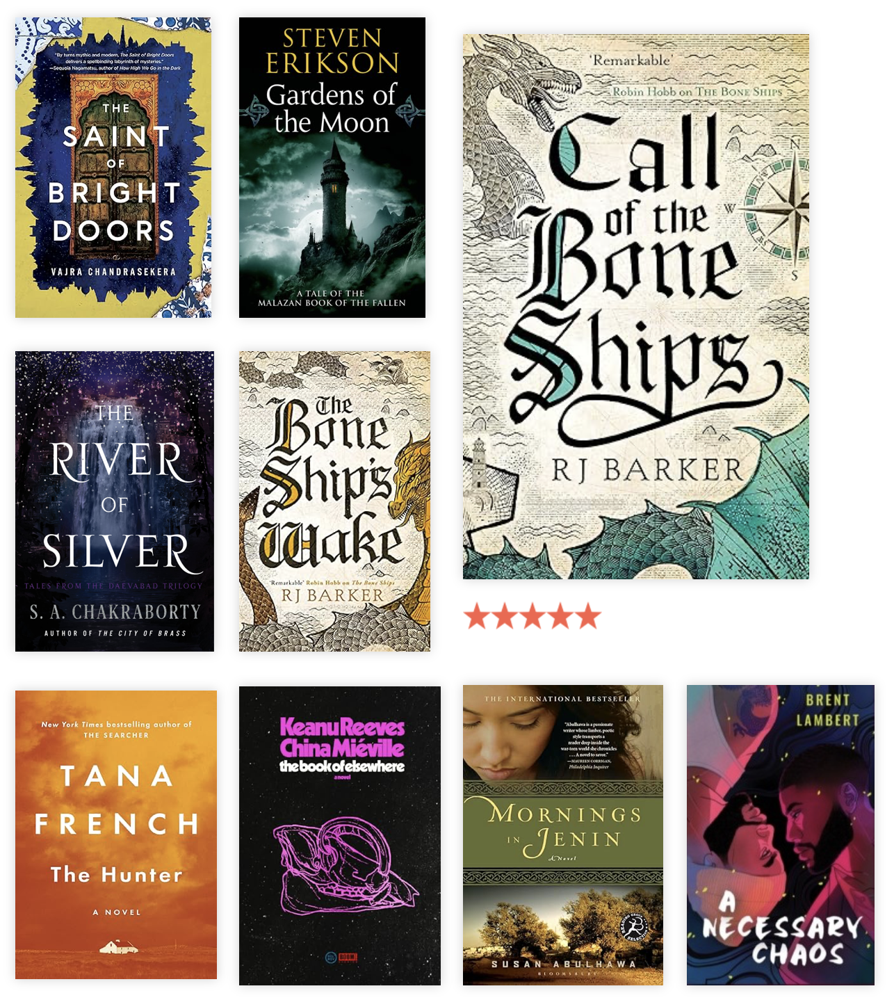 Two books: Susan Abulhawa, Josiah Bancroft, Carissa Broadbent, Shannon Chakraborty, Rin Chupeco, Piper CJ, Rachel Gillig, John Keay, Judy Lin, Vaishnavi Patel, Ava Reid, Samantha Shannon, M.L. Wang