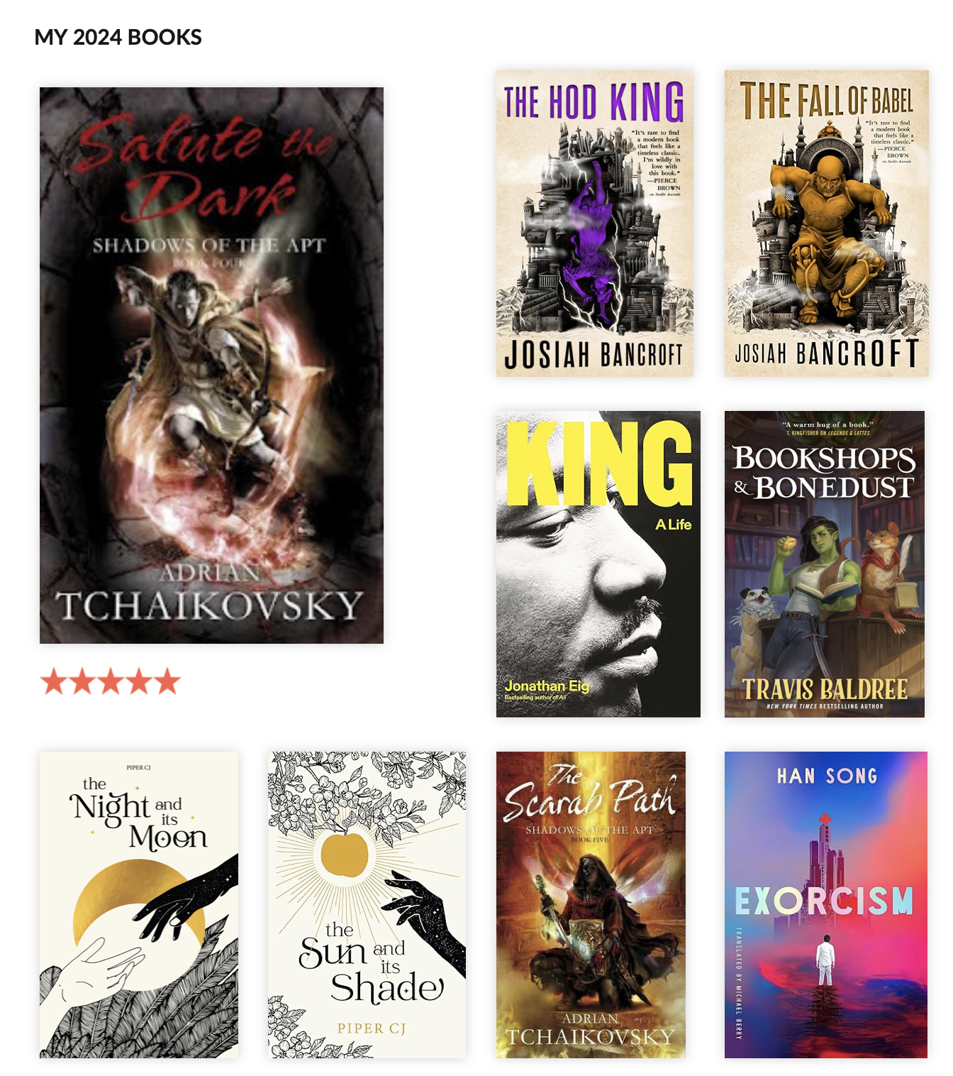 According to Goodreads, I read 185 books in 2024, comprising a grand total of 81,191 pages, or 221.83 pages per day. That’s assuming I finish Katherine Addison’s The Grief of Stones tonight, which I’m going to, because I have to start reading The Way of Kings tomorrow and I want to be halfway through that big bastard by the end of the day.