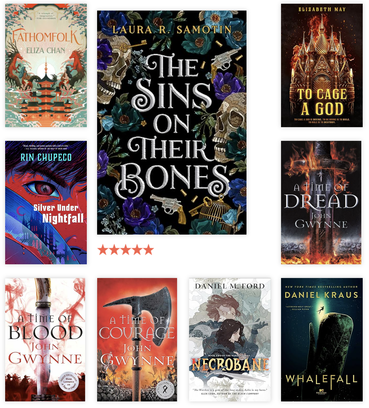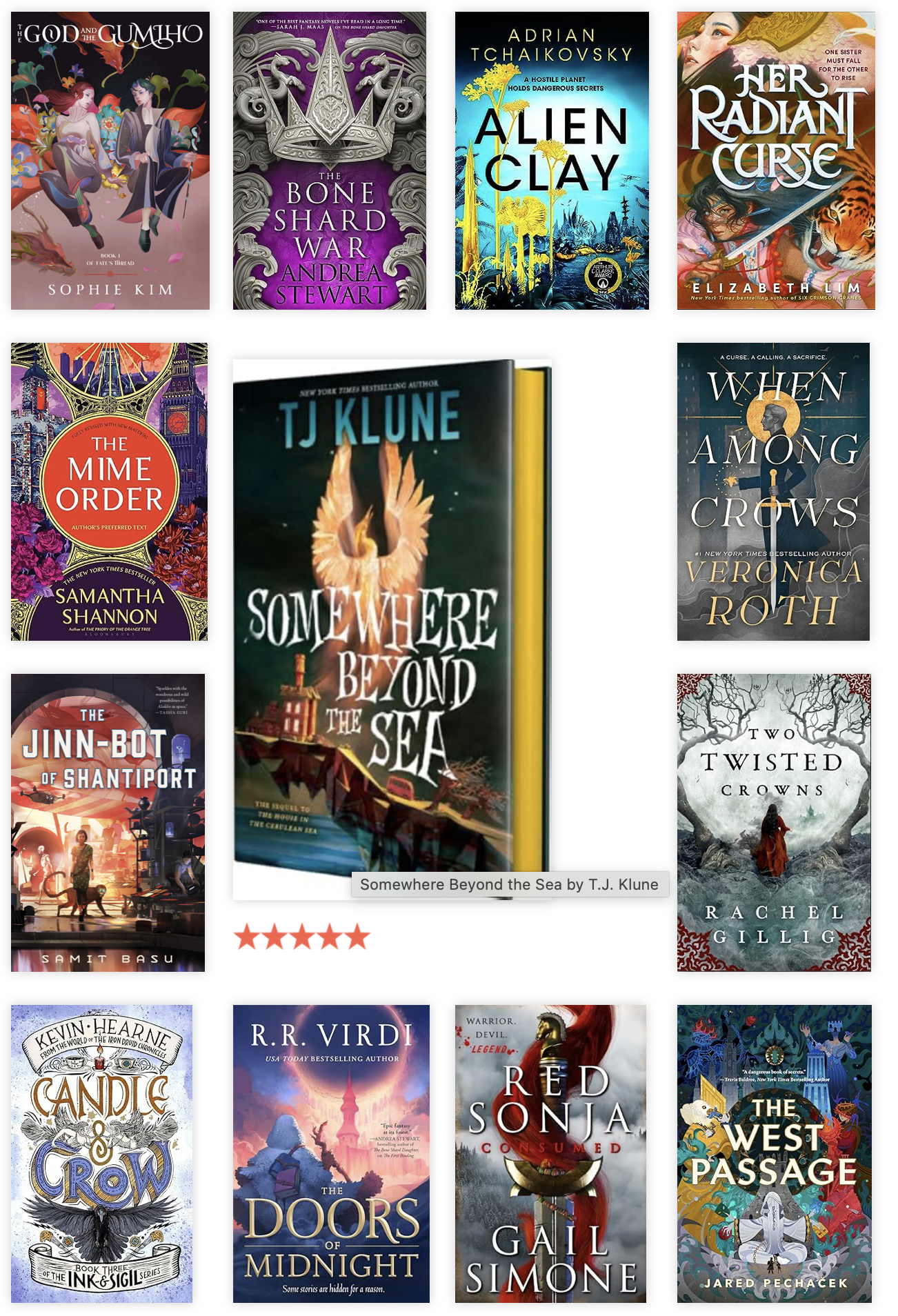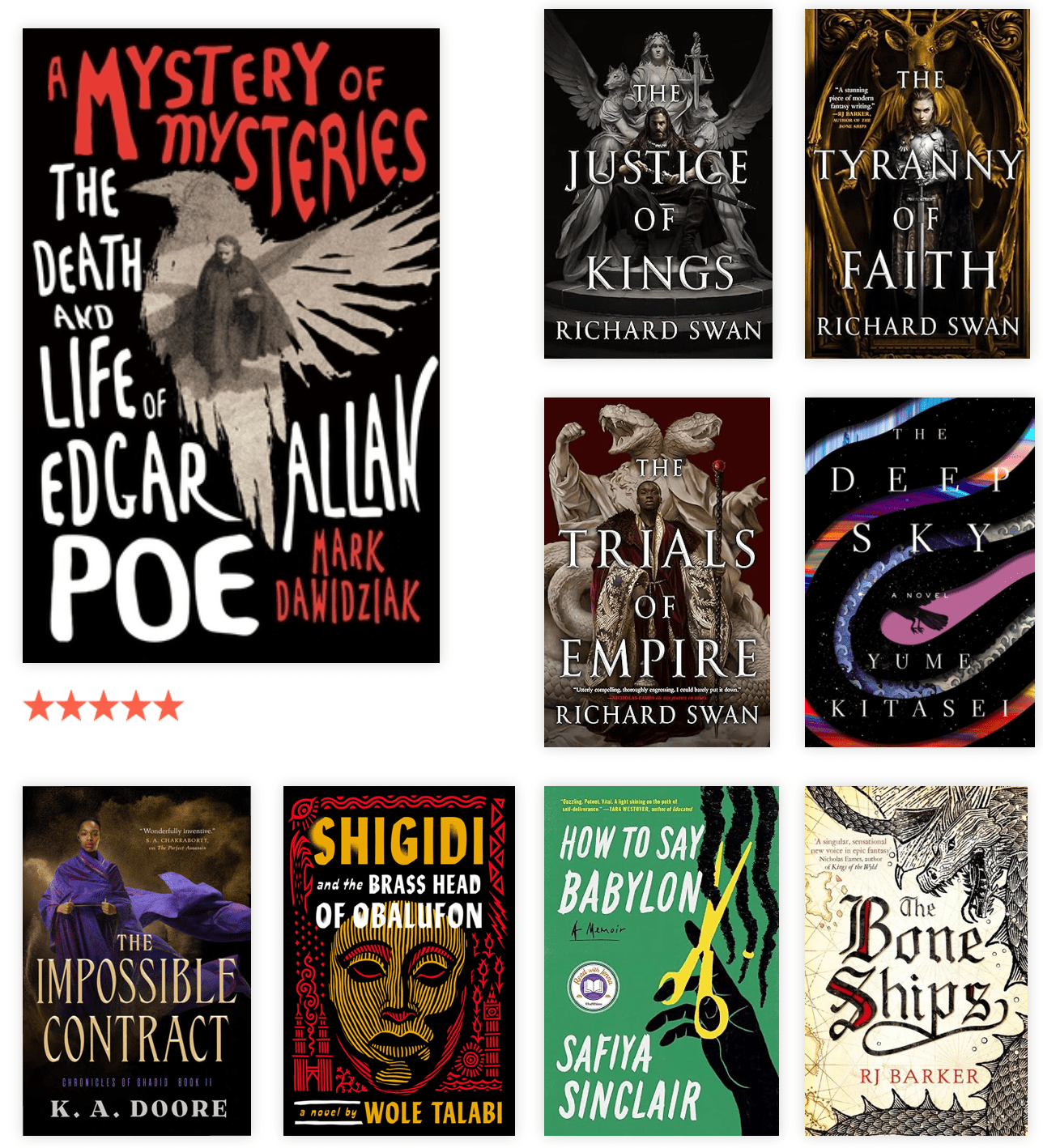 Honorable Mention, in No Particular Order: A Mystery of Mysteries: The Death and Life of Edgar Allan Poe, by Mark Dawidziak; The Honey Witch, by Sydney J. Shields; House of Hunger, by Alexis Henderson; The God and the Gumiho, by Sophie Kim; This is Why They Hate Us, by Aaron Acevedo; The Bone Ship Trilogy by R. J. Barker; Somewhere Beyond the Sea, by T.J. Klune; Blood at the Root, by LaDarrion Williams; The Vagrant Gods series, by David Dalglish; Morning Star, by Pierce Brown; Bookshops & Bonedust, by Travis Baldree, Moon of the Turning Leaves, by Waubgeshig Rice, and The Fury of the Gods, by John Gwynne.
