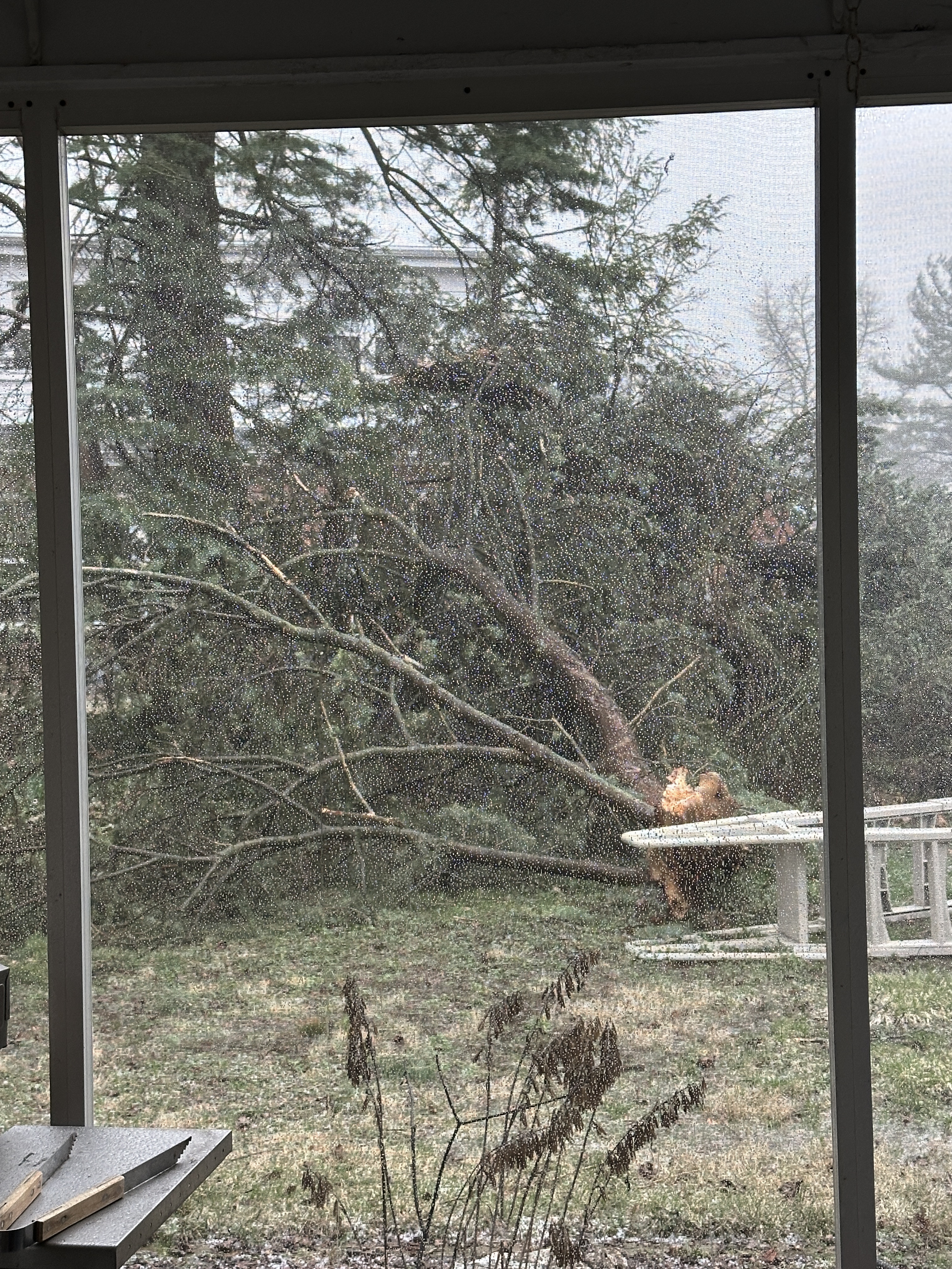 I think today was the closest I’ve ever come to telling everyone in the house to head for the basement without an actual tornado warning. The top video is out my front window; I saw the first tree across the road fall almost immediately when the wind started, and missed the second one. My wife saw the tree fall in our back yard (second picture) which is the second time that our neighbors behind us have had a tree fall into our yard, thus becoming, by Indiana law, our problem.