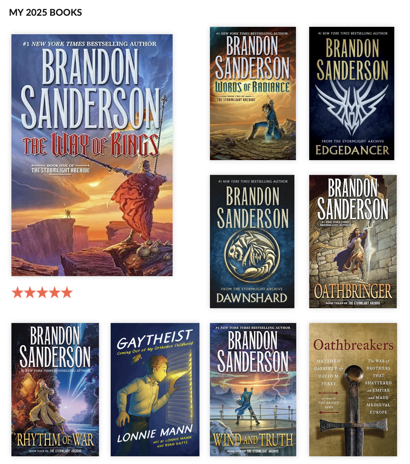 According to Goodreads, I read 189 books in 2025, at 87,775 pages. According to Storygraph, I read 189 books in 2025, at 88,360 pages. Let’s call it 88,000 pages, as I’m entirely uninterested in trying to reconcile the discrepancy between the two. At the beginning of this year I started a bunch of different book app accounts and said that I was going to eventually settle on one, and Goodreads and Storygraph scratch slightly different itches, so I spent the year keeping both updated. 88K pages works out to 241 pages a day. How? I read every single night for at least half an hour before going to bed, and on weekends and days off I generally get up between 6:00 and 8:00 and spend a few hours reading in my library. For the record, I’m not trying to get up that early to read; believe me, I’d kill to be able to sleep until noon again if I wanted to. This is one of my body’s ways of showing me I’ve gotten old, apparently, but it’s working out for my reading, I guess.