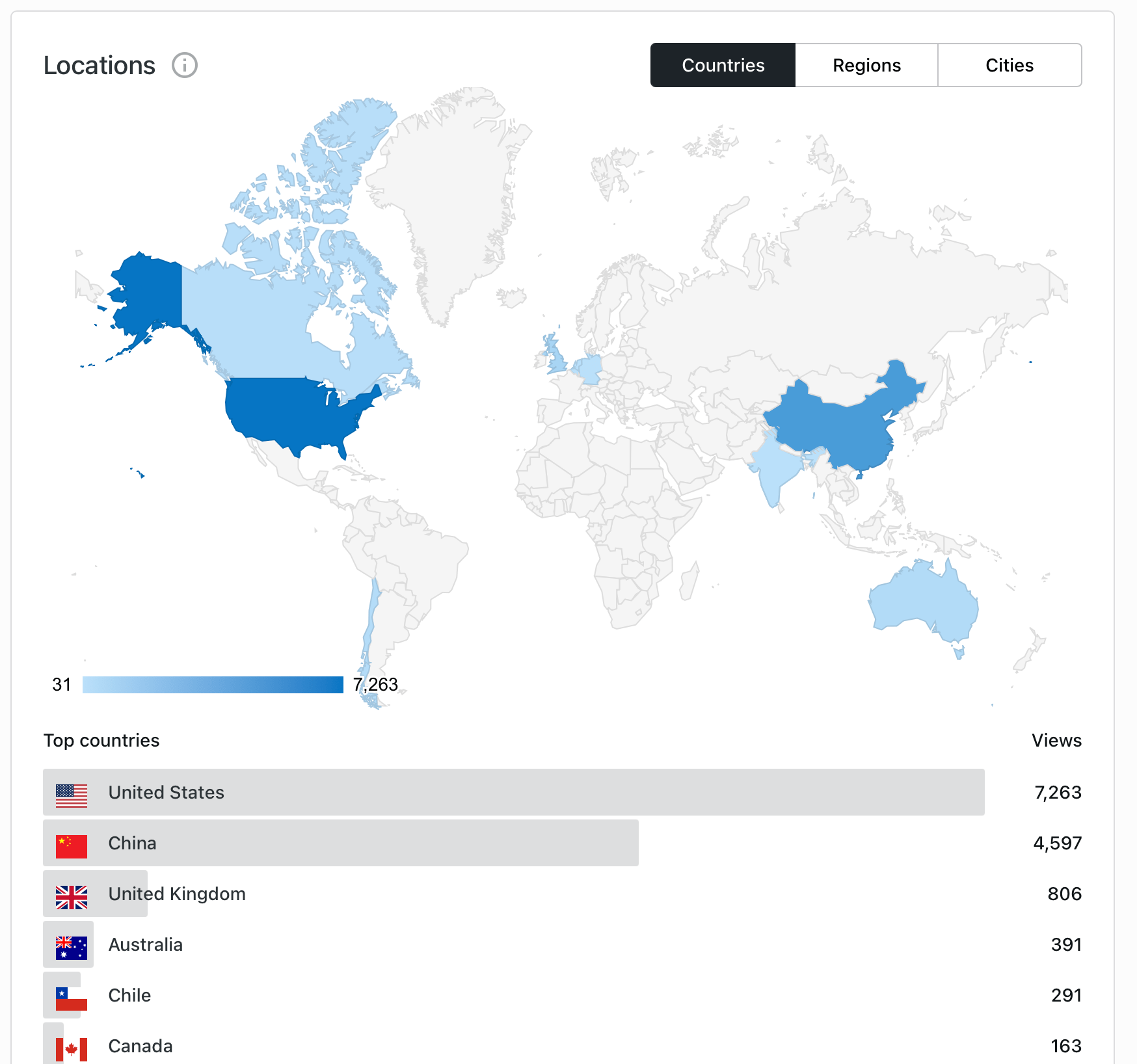 Seriously, what’s going on here? October 31 was the highest traffic day since 2015 until November 1, which was the highest traffic day since 2015 until yesterday, which was the highest traffic day since 2015 until– goes and looks— oh, basically right now, since I’m 7 views short of yesterday’s numbers. Engagement doesn’t really seem to be going anywhere and I’m not seeing anything weird in what limited data I’m getting from referrals, and while the immediate impulse is to suspect bots, if they are bots, has WordPress suddenly lost the ability to keep them from showing up in our statistics? Or turned it off? A lot of this traffic is from China but the last couple of days it’s been mostly American. Here’s the geography numbers: